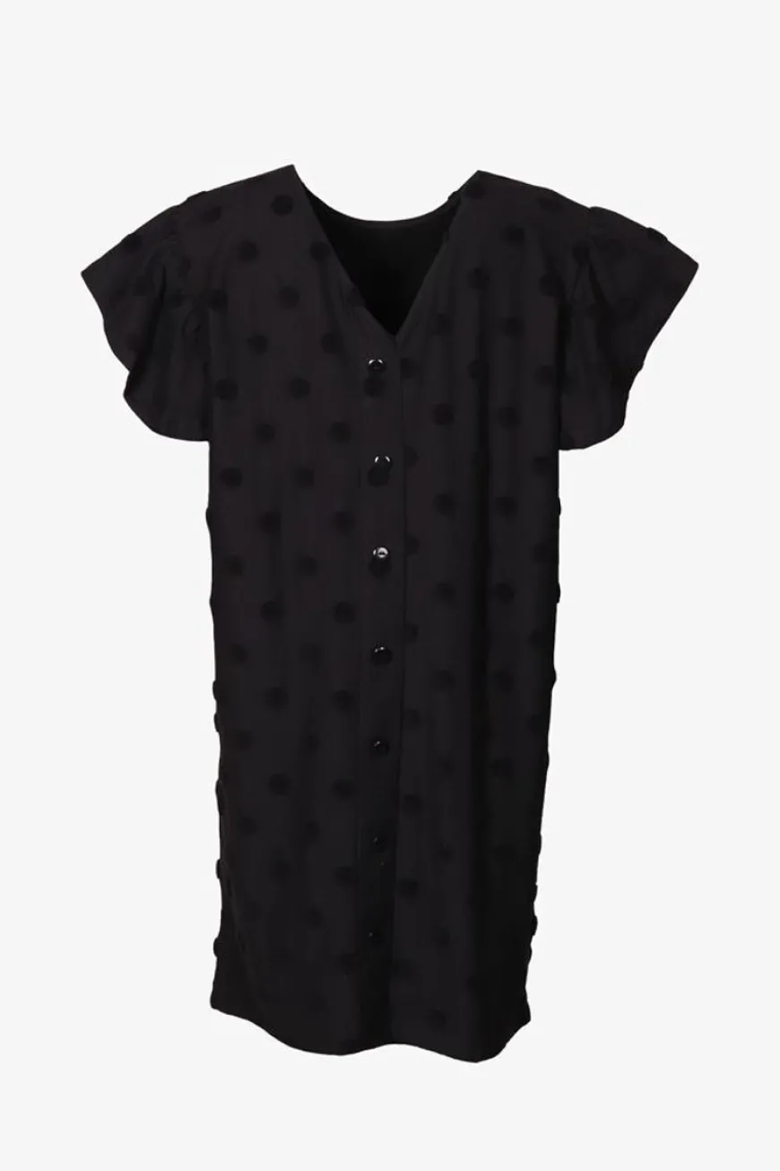 Aarre -Merkin Musta Aida Mekko Isolla Dot-Kankaalla.Rento Ja Monikäyttöinen Aida -Mekko On Valmistettu Upeasta Struktuuri-Materiaalista! Big Dot On Trikoon Paksuinen Neulos, Jossa On Froteemaisia Täpliä, Jotka Kohoavat Neuloksen Pinnasta Tehden Siitä Ihanan Eläväisen. Mekkoon Voi Asusteita Vaihtamalla Pukeutua Niin Arkeen Kuin Juhlaan. Voit Pukea Mekon Napit Eteen Tai Taakse, Mieltymyksesi Mukaan! Malliltaan Mekko On Suora Ja Melko Väljä, Ja Se Pukeekin Hyvin Montaa Eri Vartalomallia. Mekossa On Lyhyet Frillahihat Ja V-Pääntie. Helma On Polvimittainen. Huomioithan, Että Materiaali Ei Sisällä Elastaania, Joten Kangas Ei Juurikaan Jousta.Huomioithan Että Nappilista Ei Ole Toimiva, Vaan Napit Ovat Ainoastaan Koristeena! Napit Ovat Myös Saattaneet Jättää Mustaan Kankaaseen Vaaleampia Painaumia Viikattuna Ollessaan, Mutta Ne Lähtevät Viimeistään Ensimmäisessä Pesussa.