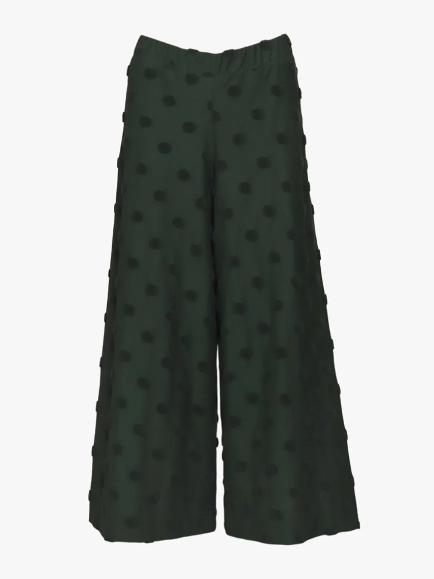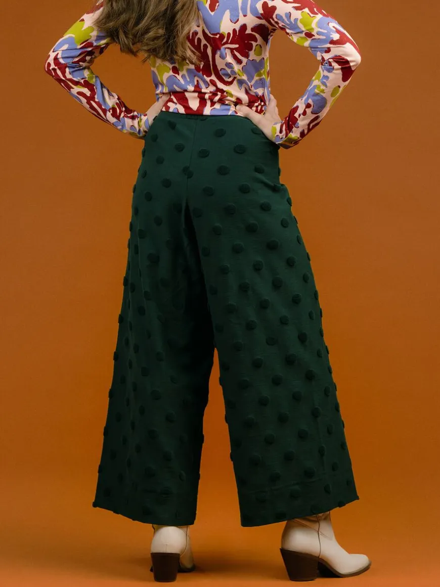 Aarre -Merkin Alex Culotteshousut Vihreänä Isolla Dot-Kankaalla.Korkeavyötäröiset Culottes-Malliset Housut Upeassa Tummanvihreässä Sävyssä Ihastuttavat Kerta Toisensa Jälkeen! Monipuolisen Ja Helposti Yhdisteltävän Mallin Ansiosta Nämä Tekee Mieli Pukea Joka Päivä. Yhdistä Niin Istuvien Ribbipaitojen Kanssa Kuin Oversized Collegepaitojen Kanssa. Housut Sopivat Myös Tyylikkäästi Mekkojen Kanssa Puettavaksi.Dot-Kangas On Paljon Rakastettu Ja Nyt Sitä Saa Isommilla Pilkuilla! Dot-Kangas Tuo Housuihin Oman Säväyksensä. Dot On Trikoon Paksuinen Struktuurineulos, Jossa On Froteemaisia Isoja Pilkkuja, Jotka Kohoavat Neuloksen Pinnasta Tehden Siitä Ihanan Eläväisen. Huomaa, Että Dot-Kangas Ei Jousta.Housut Ovat Hyvin Istuvat Vyötäröltä, Mutta Lahkeet Levenevät Reilusti. Dot Materiaali Ei Sisällä Elastaania, Joten Housut Eivät Juurikaan Jousta, Eivätkä Myöskään Venähdä Käytössä. Vyötäröllä Leveä Kuminauha. Lahkeet Ovat Vajaamittaiset.