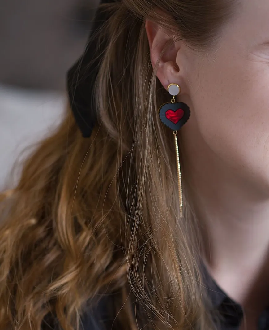 Butoni Hearts Korvakorut Ketjulla, Musta/Punainen