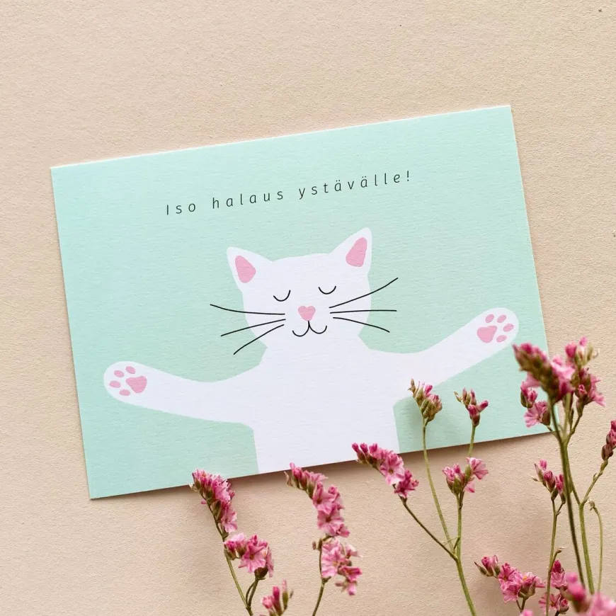 Helle Visuals -Merkin Halikissa Postikortti.Koko A6. Osoiteviivat Kääntöpuolella. Kortissa Suloinen Kissa Sekä Teksti ”Iso Halaus Ystävälle!”.Painettu Ympäristösertifioidulle Paperille Iisalmessa.
