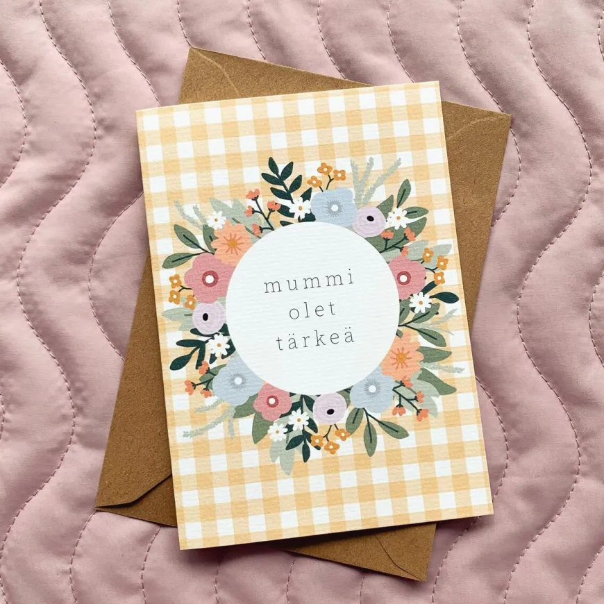 Helle Visuals -Merkin Mummi Olet Tärkeä 2-Osainen Postikortti.A6-Kokoinen Avattava Kortti Mummille. Sisäpuolella Ei Ole Tekstiä. Sisältää Ruskean Kierrätyspaperisen Kirjekuoren.Painettu Ympäristösertifioidulle Taidekartongille Iisalmessa.