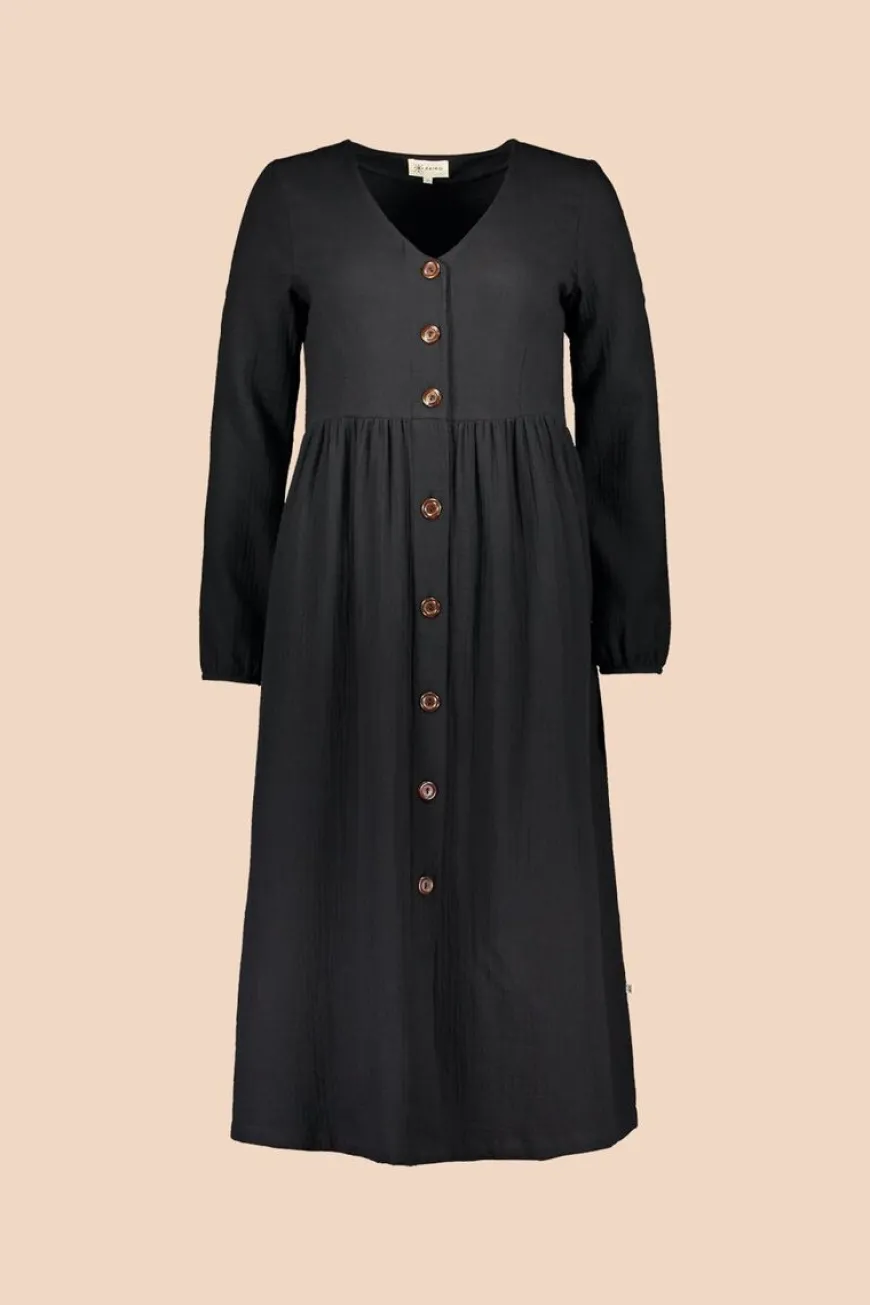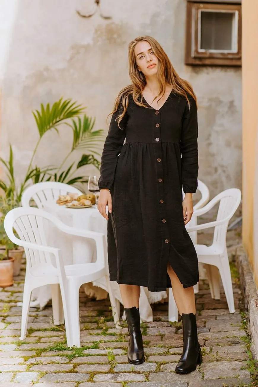 Kaiko -Merkin Suosittu Button Dress Klassisena Mustana. Musliinikankaasta Valmistettu Monipuolinen Ja Boheemi Nappimekko On Oiva Valinta Lämpimiin Kesäpäiviin, Mutta Stailaat Helposti Mekon Myös Ympärivuotiseen Käyttöön. Viileillä Keleillä Pue Sukkahousujen Ja Lempineuleesi Kanssa. Vaihtoehtoisesti Voit Jättää Napit Auki Ja Pukea Mekon Takkimaisesti Esimerkiksi Poolopaidan Ja Farkkujen Seuraksi.Miehustassa Prinsessaleikkaukset Ja Nappirivi, Vyötäröllä Kevyt Poimutus. Hihansuut On Poimutettu Kuminauhalla, Jonka Ansiosta Hihoihin Muodostuu Kaunista Volyymia. Ei Vuoria.