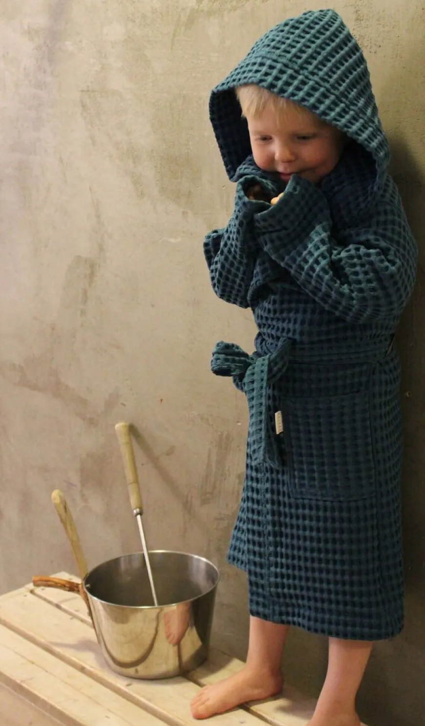 Keltainen Design -Merkin Lasten Kylpytakki Petroolin Sävyssä.Kylpytakki On Ihanan Helppo Ja Nopea Vetästä Päälle Saunan, Uinnin Ja Kylvyn Jälkeen Kotona & Mökillä. Kylpytakissa On Mukava Myös Vain Oleilla Hetki Suihkun Jälkeen. Tämä Isoruutuisesta, Paksusta Vohvelikankaasta Valmistettu Hupullinen Kylpytakki On Kiva Sekä Omille Aarteillesi Että Lahjaksi. Takista Löytyy Myös Taskut! Kokoja Taaperosta Teiniin.