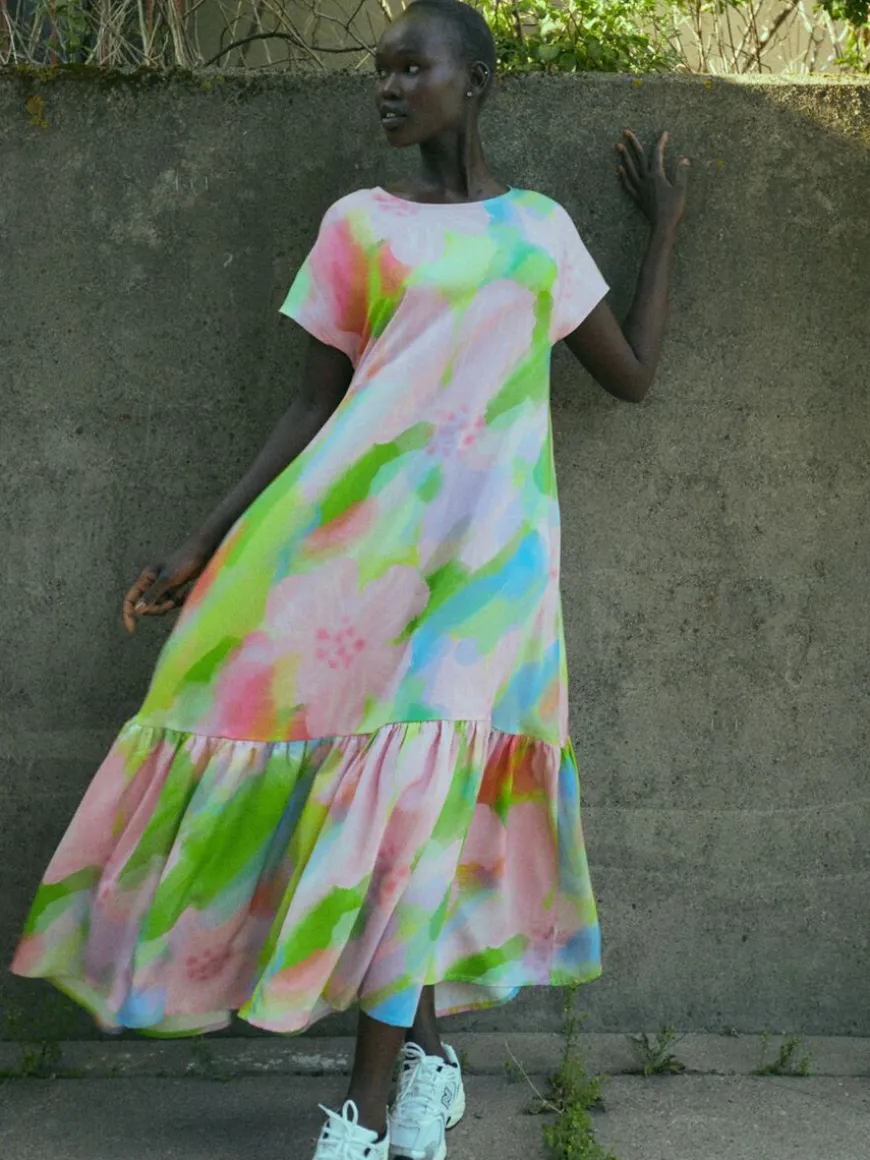 Mainio -Merkin Pink Bloom Mekko.Ylellinen Mekko Upeasti Laskeutuvaa, Kudottua Tencel Lyocellia, Jota Koristaa Ihastuttava Maalauksellinen Pink Bloom Kuosi. Mekko Sopii Ihanasti Kesään, Ja Kerrostamalla Menee Käytössä Ympärivuoden. Jätä Mekko Rennosti Hulmuamaan Tuulessa, Tai Kuro Lempivyölläsi Vyötäröä Esiin!Mekossa On Kätevät Taskut Sivusaumoissa. Kaunis Runsas Frillahelma.