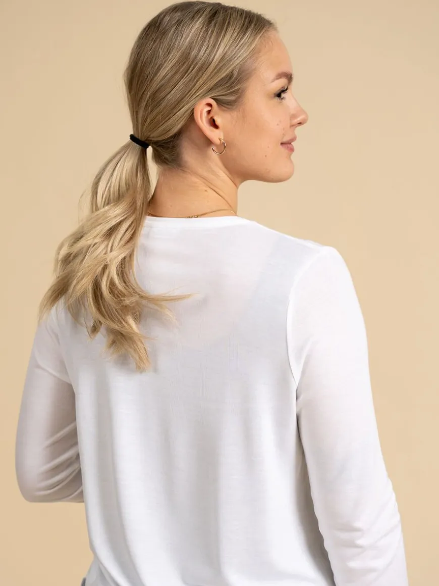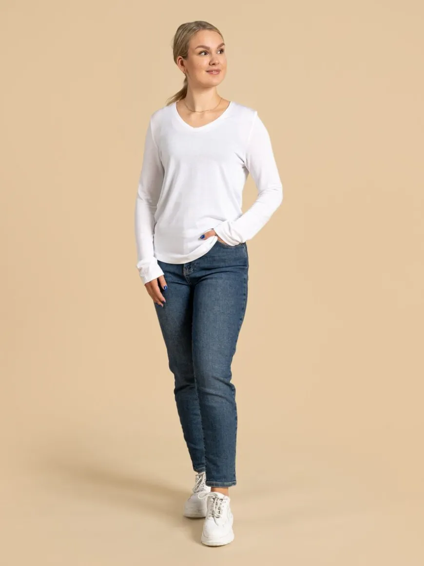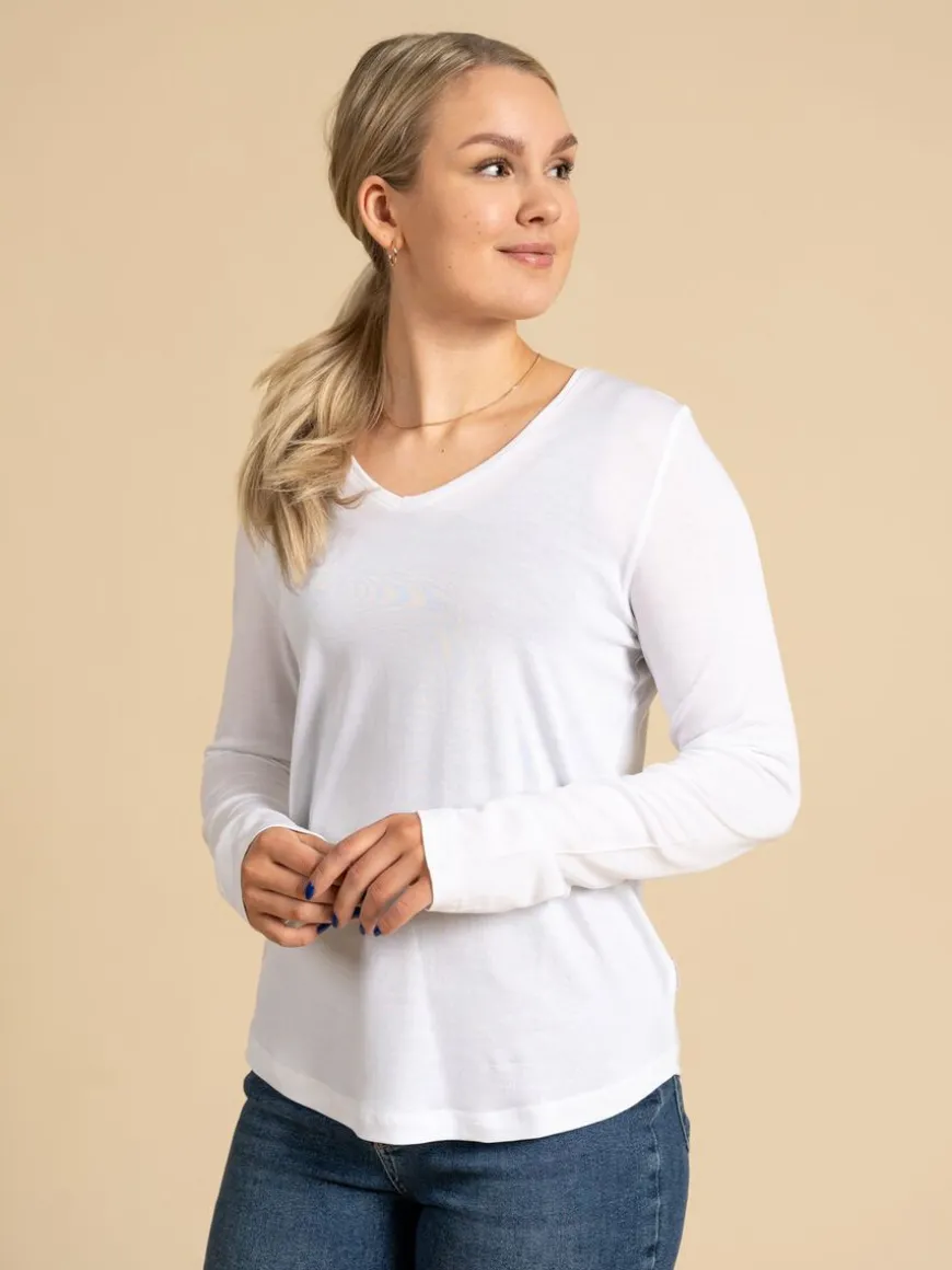Riva Clothing -Merkin Valkoinen Aava Pitkähihainen.Ilmava Ja Kauniisti Laskeutuva Aava On Lyocellia, Mikä Tuntuu Ihoa Vasten Silkkisen Pehmeältä. Pitkähihainen On Helppo Pukea Minkä Tahansa Alaosan Kanssa, Ja Talvella Sujahtaa Mukavasti Neuletakkien Alle.Pääntie On V-Mallinen, Helma On Hieman Pyöristetty.