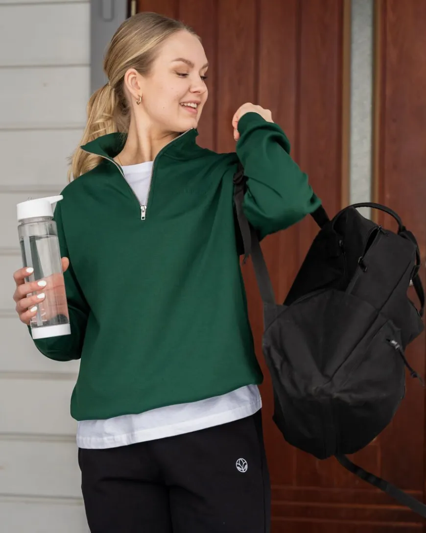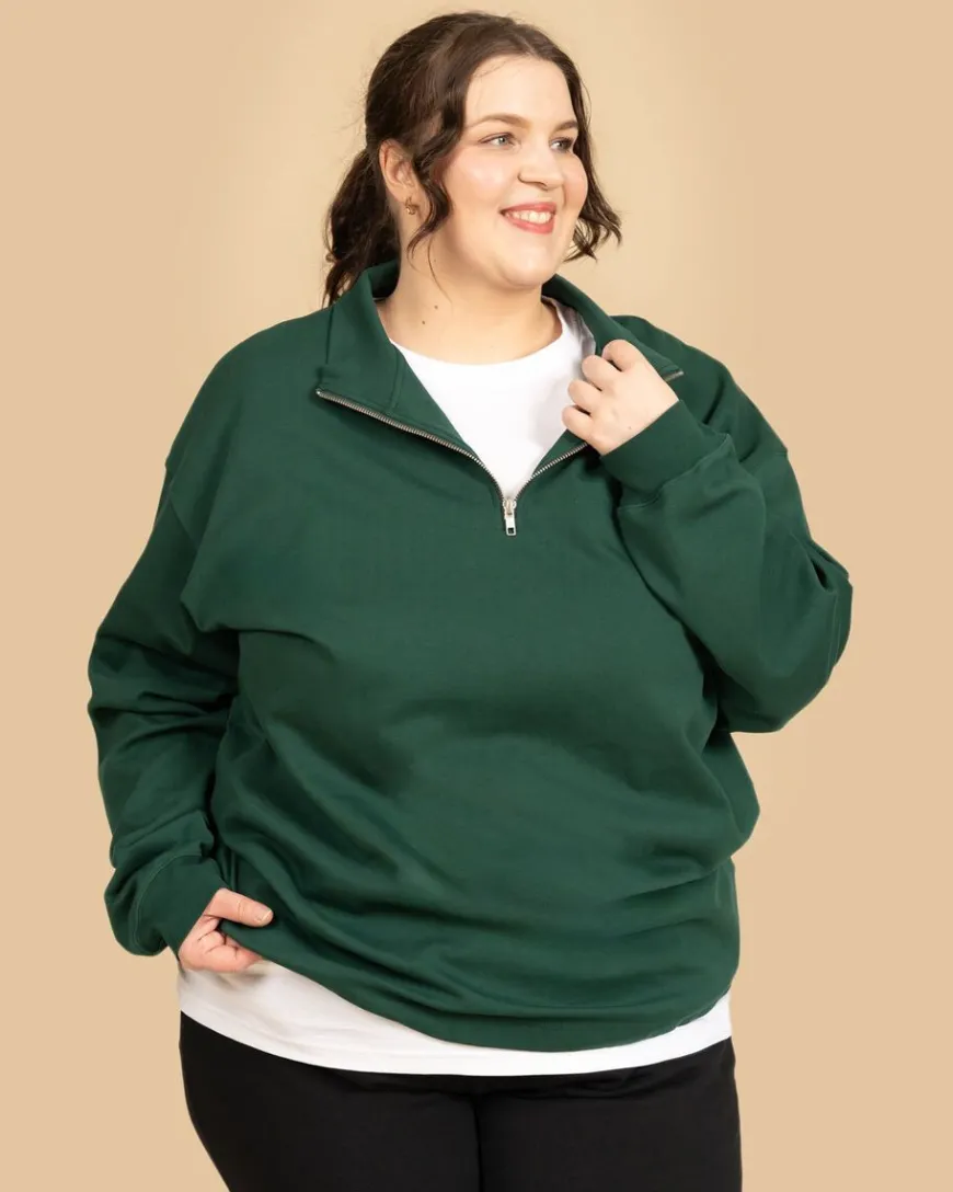 Riva Clothing -Merkin Tummanvihreä Half-Zip Collegepaita.Rennolla Ja Väljällä Mitoituksella Valmistettu Vetoketjullinen Collegepaita On Ihana Lisä Vaatekaappiisi Jos Tarvitset Tyylikkään Paidan Rentoihin Päiviin. Yhdistä Farkkujen Tai Collegehousujen Kanssa, Tai Pue Leggingsien Kanssa Lenkille.Half-Zip Kollari On Sporttinen Vaatekappale Viileämmille Keleille. Korkeampi Kaulus Ja Helmassa Oleva Kiristysnauha Lisäävät Sporttisia Elementtejä. Kiristysnauhan Avulla Voit Säätää, Kuinka Korkealle Collegepaita Asettuu.Mitoitus On Rento Ja Väljä. Jos Haluat Istuvan Ja Vartalonmyötäisemmän Mallin, Ota Kokoa Pienempi. Jos Haluat Rennon Mallin Kuten Kuvissa, Ota Oma Kokosi.