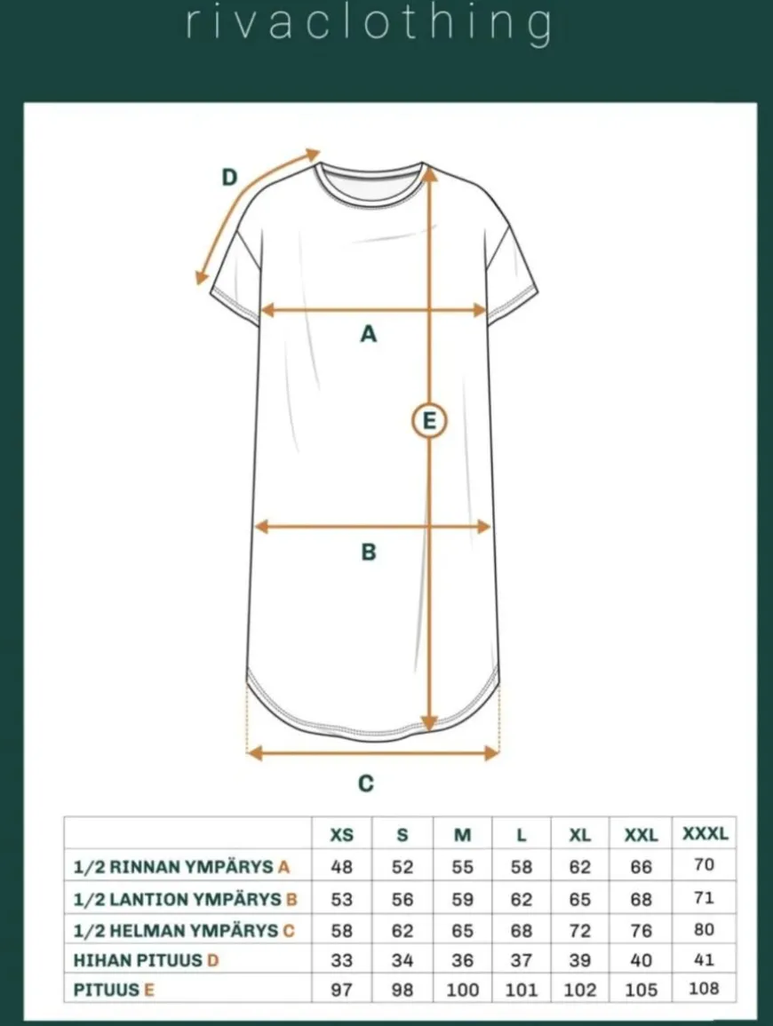 Riva Clothing -Merkin Hortensia T-Paitamekko.Ekstra Pitkä T-Paita Vai T-Paitamekko Me Vastataaan Kumpikin! Voit Käyttää Vaatetta Niin Mekkona Leggingsien Ja Sukkahousujen Kanssa, Tai Pukea Housujen Kanssa. Pituus On Hieman Polven Yläpuolelle Noin 165Cm Mittaisella Käyttäjällä, Riippuen Omista Mittasuhteista.Tämä T-Paita On Normaalista Mallia Pitkä Versio. Pitkän Ja Pyöristetyn Helman Ansioista Paidasta Ei Lopu Pituus Kesken Pidemmälläkään Ihmisellä. Istuvuus On Rento. Mallissa On Lasketut Olkapäät, Minkä Ansiosta Se Istuu Hyvin Kaikenkokoisille Hartioille. Myös Kainaloihin On Jätetty Tilaa, Jotta Kainalot Eivät Kinnaa Ja Hiosta.