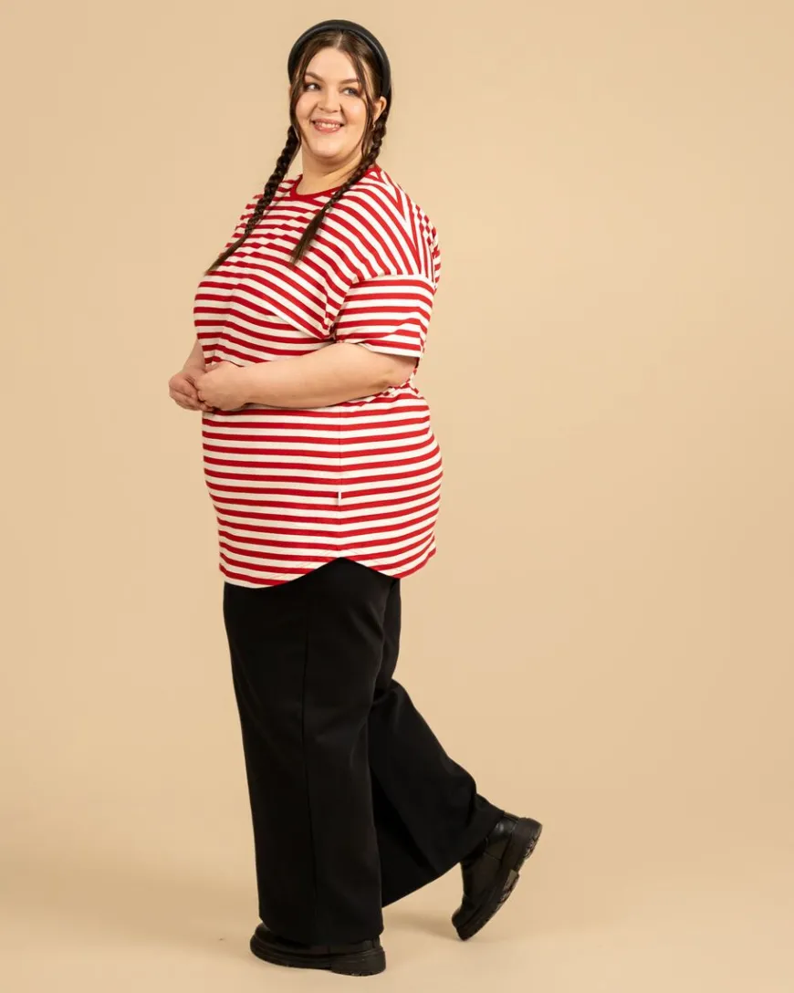 Riva Clothing -Merkin Pitkä Karpalo T-Paita. Jokaisen Vaatekaapin Yksi Kulmakivistä – Laadukas T-Paita! Raidallinen T-Paita Ja Farkut Toimii Aina, Mutta Yhdistät Paidan Hyvin Moneen Eri Asuun Ja Tilanteeseen. Pidemmän Mallisessa T-Paidassa On Lasketut Olkapäät, Minkä Ansiosta Se Istuu Paremmin Kaikenkokoisille Hartioille. Myös Kainaloihin On Jätetty Aiempaa Enemmän Tilaa, Jotta Kainalot Eivät Kinnaisi Ja Hengittävyys Olisi Taattu. Pyöristetty Helma Laskeutuu Kauniisti Kapeillekin Lanteille, Mutta Antaa Myös Tilaa Leveämmälle Lantiolle. Samalla Näimme, Että Pidempää, Pyöristetyllä Helmalla Olevaa T-Paitaa Voi Käyttää Mekon Tilalla, Yhdistettynä Esimerkiksi Neuletakkiin Ja Legginseihin. Pidempi Selkäisille Ihmisille Tämä Malli Taas Laskeutuu Mukavasti Tarpeeksi Pitkälle, Eikä Takapuoli Pääse Vahingossa Vilkkumaan.