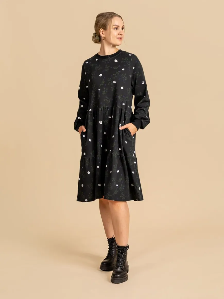 Riva Clothing -Merkin Mustikka Kuosinen Mekko.Pitkähihainen Mekko Ihanalla Mustikka Kuosilla Toimistolle Ja Vapaa-Aikaan. Mekko On Helppo Kerrostaa Viileämmillä Keleillä Sukkisten Kanssa Ja Talvella Puet Helposti Vielä Muhkean Neuletakin Mekon Päälle.Kuosi On Saanut Inspiraationsa Suomalaisen Metsän Marjoista. Kuosissa Leikittelee Mustikan Marjat, Lehdet Ja Pienet Valkoiset Kukat. Pohjaväri On Tummanharmaa, Jolloin Siniset Mustikat Ja Vihreät Lehdet Pääsevät Oikeuksiinsa.Mekossa Pyöreä Pääntie Ja Nyt Myös Kätevät Taskut! Mustikka Mekko On Polvimittainen Ja Sen Hihat Ovat Täysipitkät.