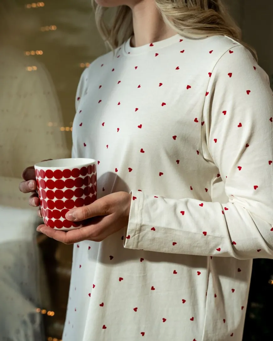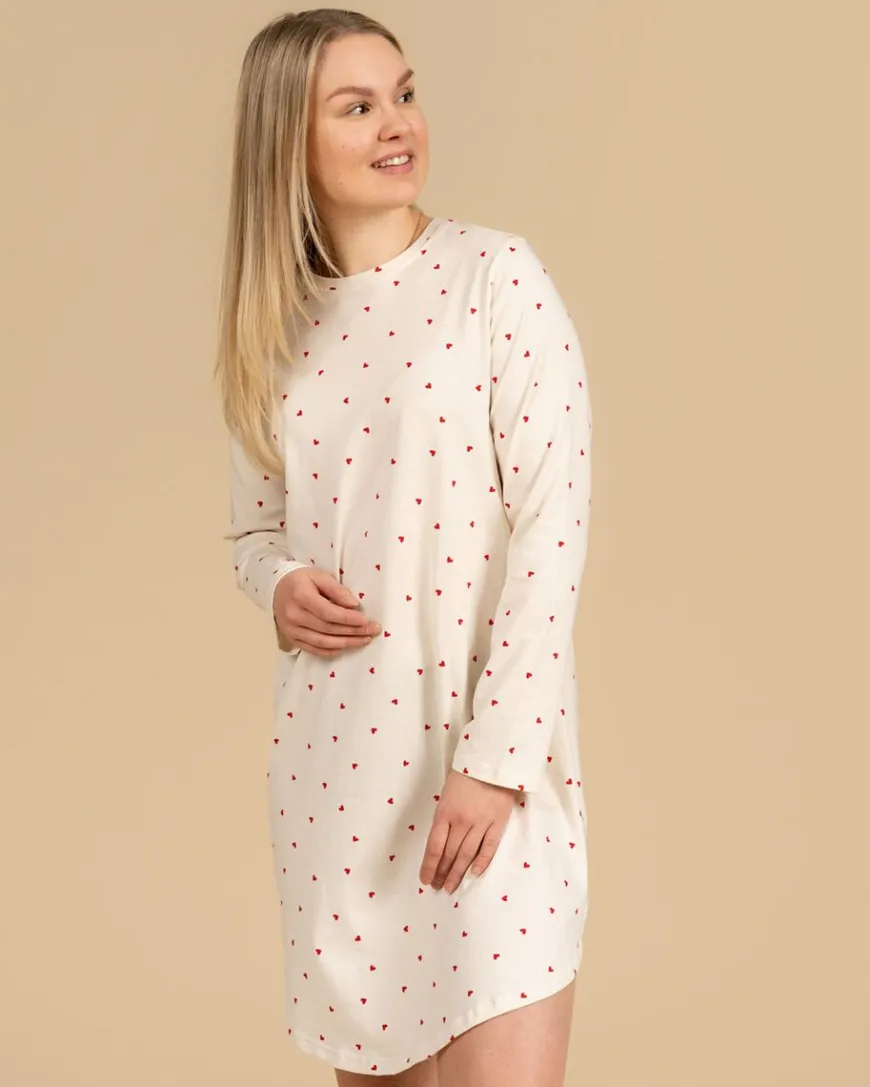 Riva Clothing -Merkin Yömekko Sydämet Kuosilla.Suloinen Sydämet Yömekko On Nyt Täällä! Rento Ja Mukava Sydänkuosinen Yömekko Luonnonvalkoisella Pohjalla On Ihana Itselle Tai Lahjaksi. Siinä On Miellyttävä Nukkua, Sekä Rentoilla Kotona Aamun Ajan 3Mekossa On Pitkät Hihat, Pyöristetty Helma Ja Se On Valmistettu 100% Luomupuuvillasta.
