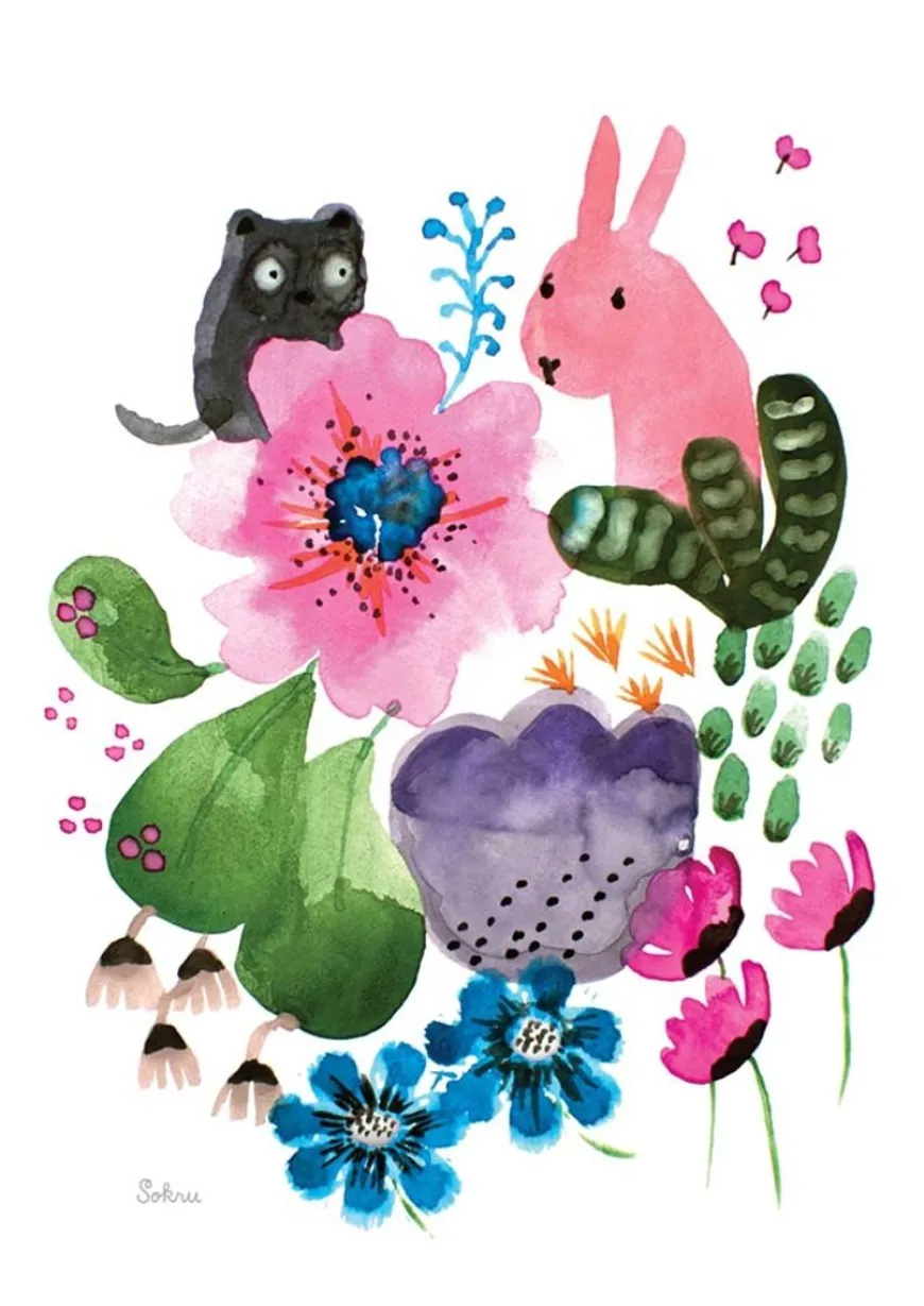 Sokru -Merkin Puutarhakaverit Postikortti.Sokru On Kuvitukseen, Kuosi- Ja Visuaaliseen Suunnitteluun Keskittynyt Suunnittelutoimisto. Outi Virtanen Kuvittaa Printtejä, Kankaita, Kirjoja Ja Tapetteja. Kuvitusten Aiheet Liittyvät Skandinaaviseen Luontoon Ja Niissä Vilisee Kasveja Ja Erilaisia Hahmoja.