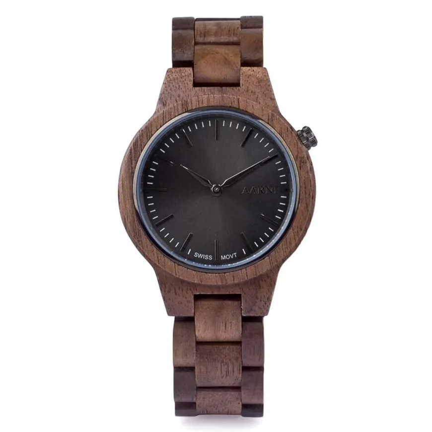 Aarni -Merkin Vega Rannekello Pähkinäpuusta Valmistettuna.Tummaa Tyylikkyyttä.Vega On Klassisen Tyylikäs Kello, Jossa Pyöreä Hiilenharmaa Kellotaulu Yhdistyy Tummanruskeaan, Hienostuneeseen Pähkinäpuuhun. Selkeä Muotokieli Ja Luonnollinen Puu Antavat Kellolle Harmonisen Ilmeen. Vega Sopii Erinomaisesti Niin Arkeen Kuin Edustustilanteisiin.Kello Toimitetaan Tyylikkäässä Lahjakotelossa.Kaikilla Aarnin Tuotteilla On Kolmen Vuoden Takuu.