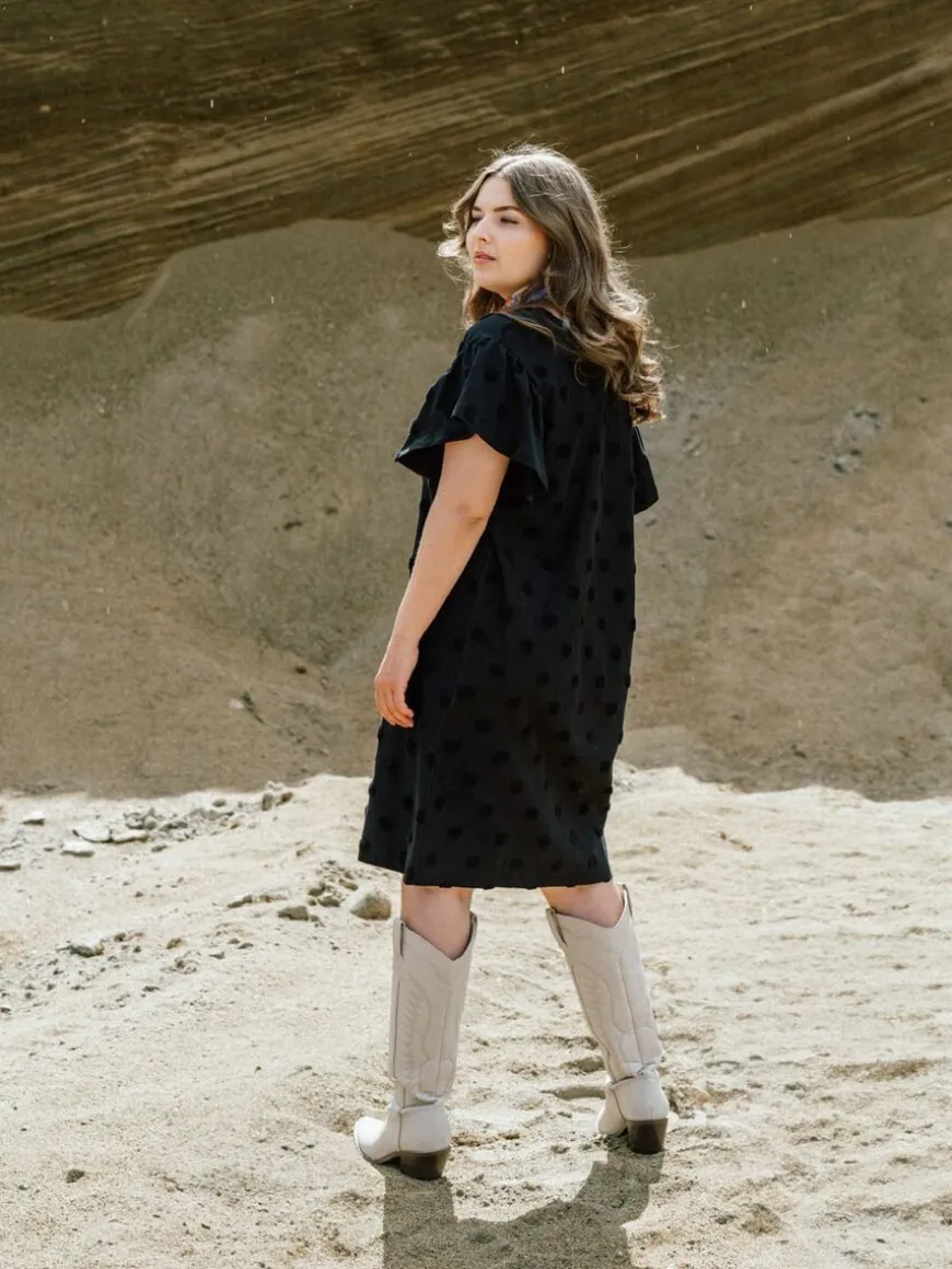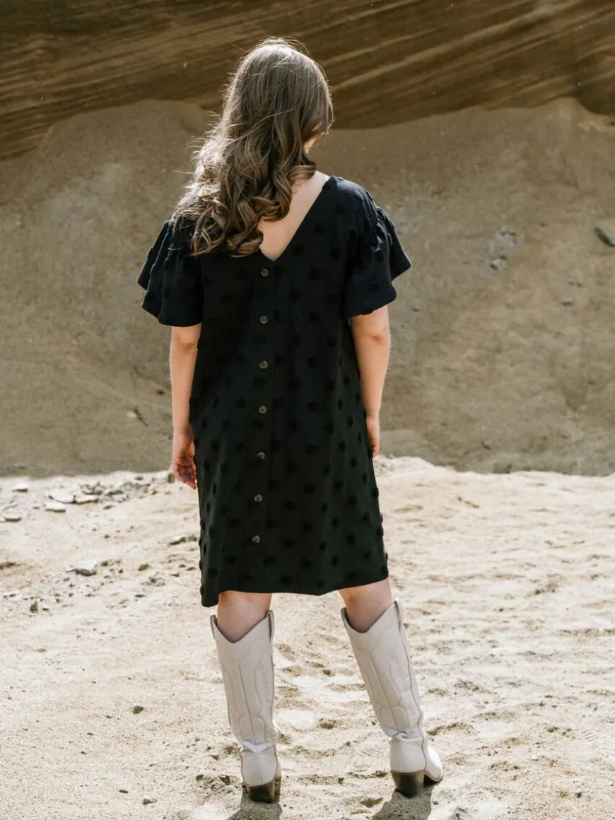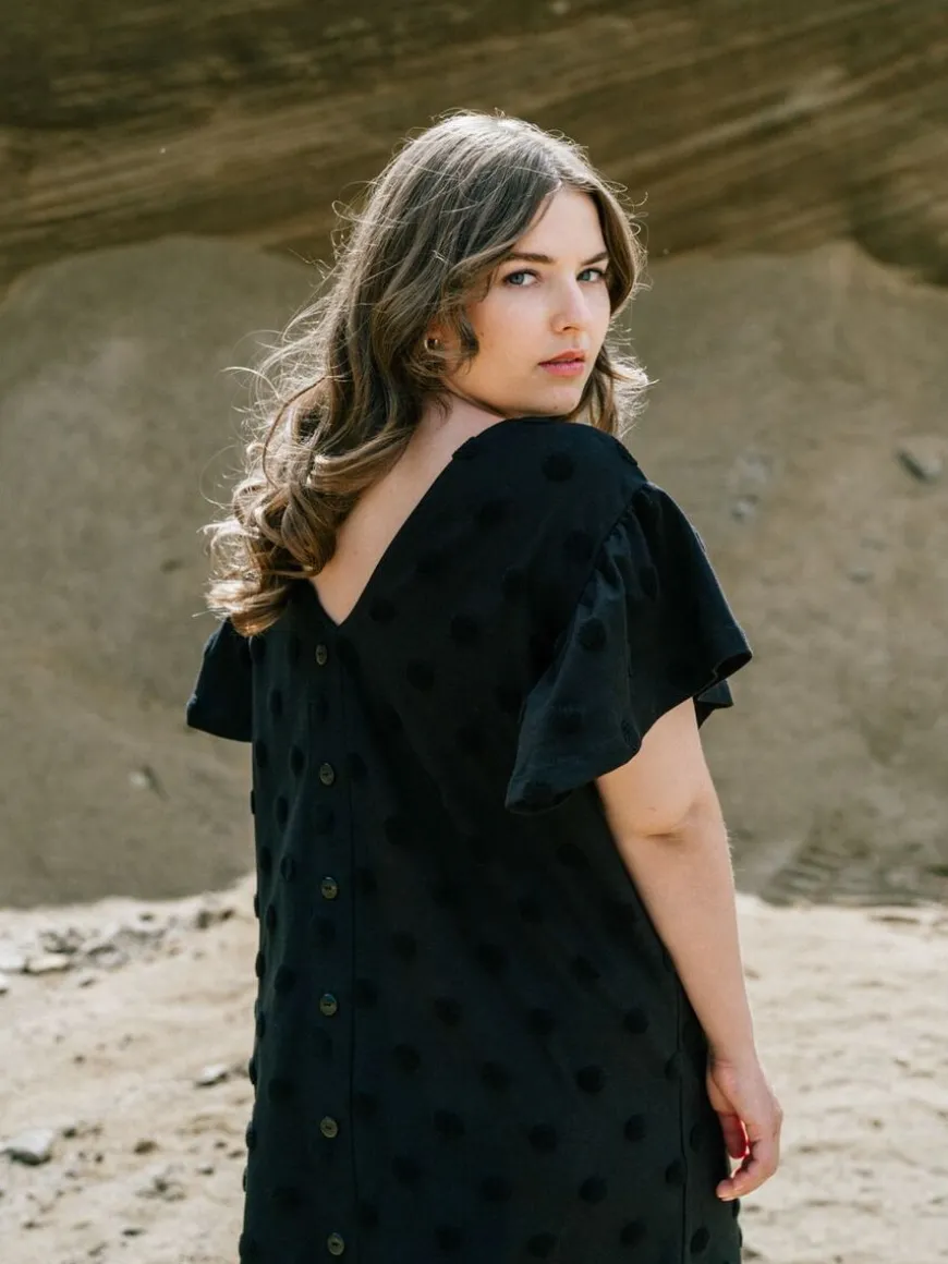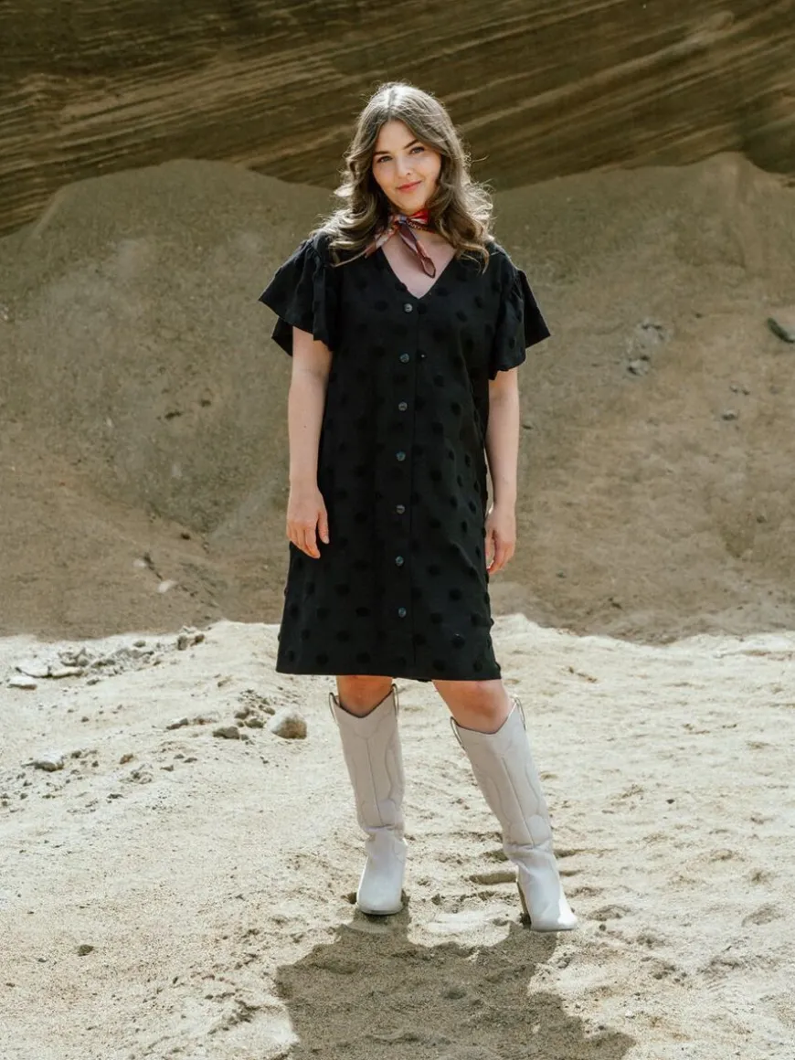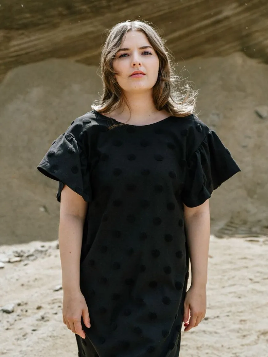 Aarre -Merkin Musta Aida Mekko Isolla Dot-Kankaalla.Rento Ja Monikäyttöinen Aida -Mekko On Valmistettu Upeasta Struktuuri-Materiaalista! Big Dot On Trikoon Paksuinen Neulos, Jossa On Froteemaisia Täpliä, Jotka Kohoavat Neuloksen Pinnasta Tehden Siitä Ihanan Eläväisen. Mekkoon Voi Asusteita Vaihtamalla Pukeutua Niin Arkeen Kuin Juhlaan. Voit Pukea Mekon Napit Eteen Tai Taakse, Mieltymyksesi Mukaan! Malliltaan Mekko On Suora Ja Melko Väljä, Ja Se Pukeekin Hyvin Montaa Eri Vartalomallia. Mekossa On Lyhyet Frillahihat Ja V-Pääntie. Helma On Polvimittainen. Huomioithan, Että Materiaali Ei Sisällä Elastaania, Joten Kangas Ei Juurikaan Jousta.Huomioithan Että Nappilista Ei Ole Toimiva, Vaan Napit Ovat Ainoastaan Koristeena! Napit Ovat Myös Saattaneet Jättää Mustaan Kankaaseen Vaaleampia Painaumia Viikattuna Ollessaan, Mutta Ne Lähtevät Viimeistään Ensimmäisessä Pesussa.