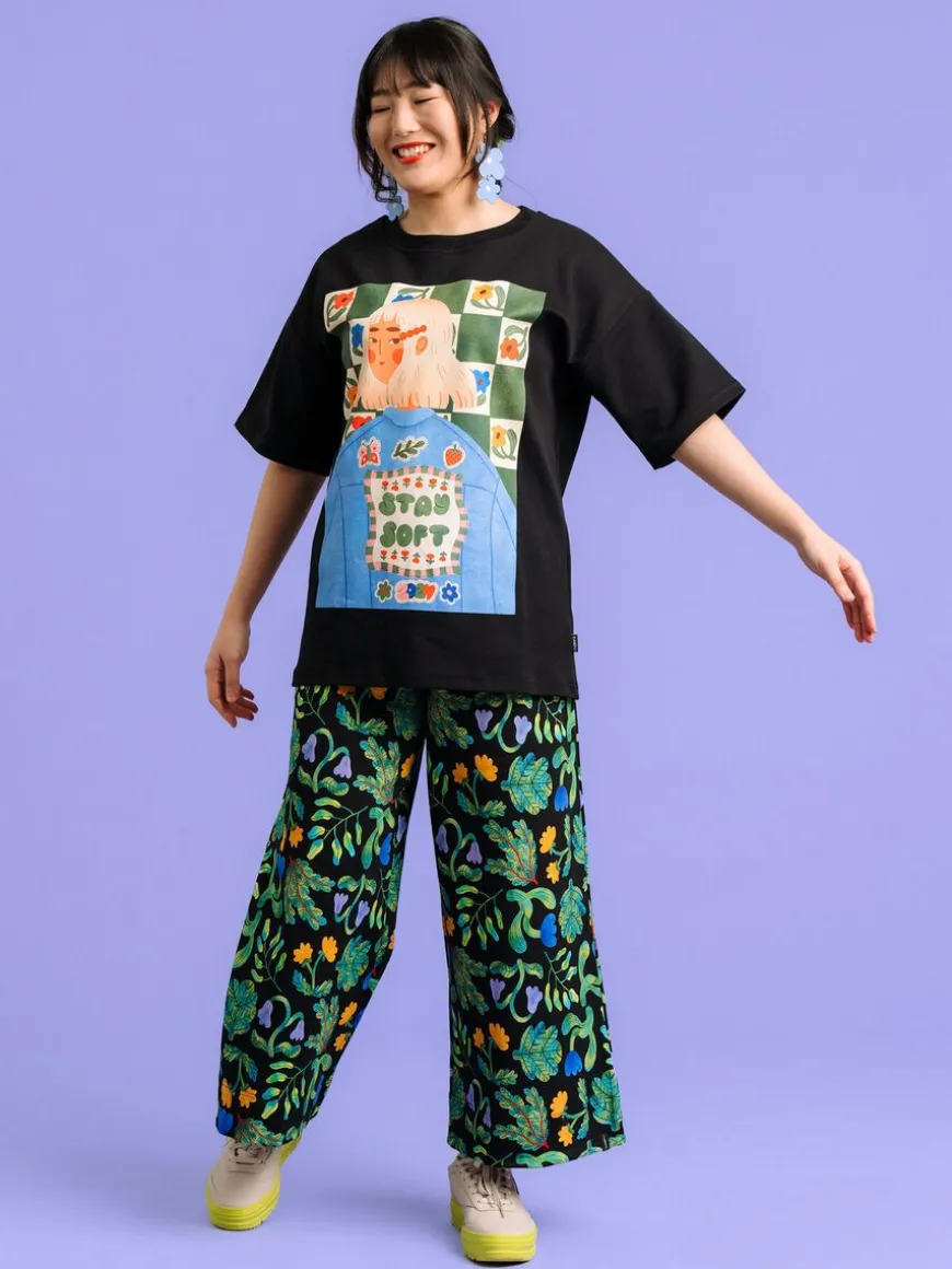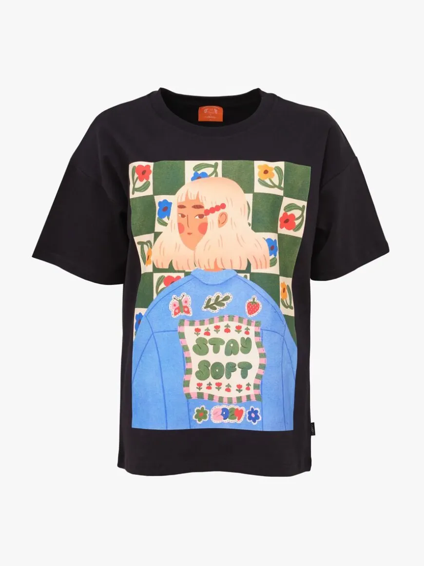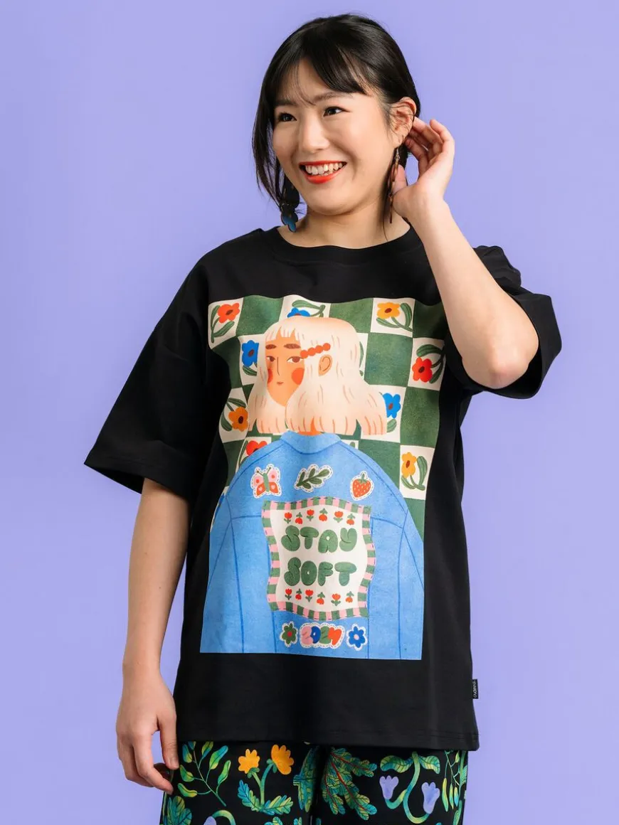 Aarre X Mia Minerva Malliston Queen T-Paita Stay Soft Printillä.Uniikin Mia Minerva X Aarre Kuvittajayhteistyömalliston Queen T-Paita On Helppo Yhdistää Niin Farkkujen, Hameiden Kuin Suorienkin Housujen Kanssa. Luo Virallisempi Asu Suorien Housujen Janilkkureiden Kanssa, Tai Yhdistä Rentoihin Farkkuihin Ja Tennareihin Vapaa-Aikaan!Mia Minervan Suunnittelema Stay Soft -Muotokuvapainatus On Tarkoitettu Muistutukseksi Ystävällisyydestä Ja Pehmeydestä Sekä Itseä Että Maailmaa Kohtaan. Paidan Materiaali On Trikoota Paksumpaa Ponto Roma -Neulosta, Jonka Ansiosta Paita On Ryhdikäs Eikä Materiaalista Kuulla Niin Helposti Läpi. Materiaali Ei Sisällä Elastaania, Mutta Neulos Joustaa Silti Jonkin Verran. Laatikkomainen, Väljä Malli, Jossa Pyöreä Pääntie Ja Lyhyet Hihat.