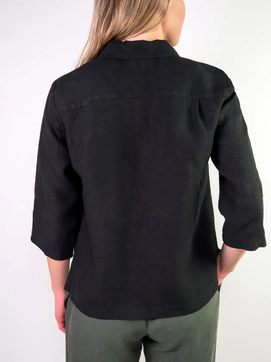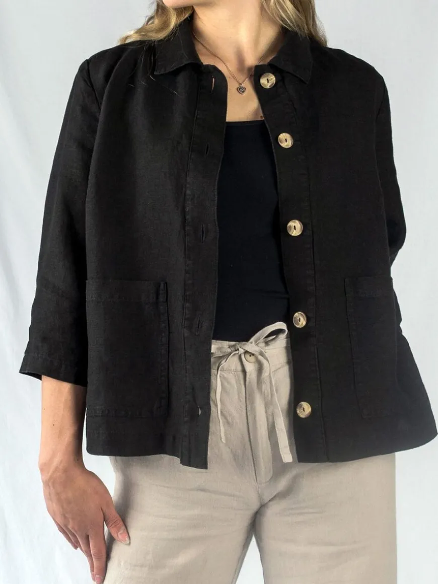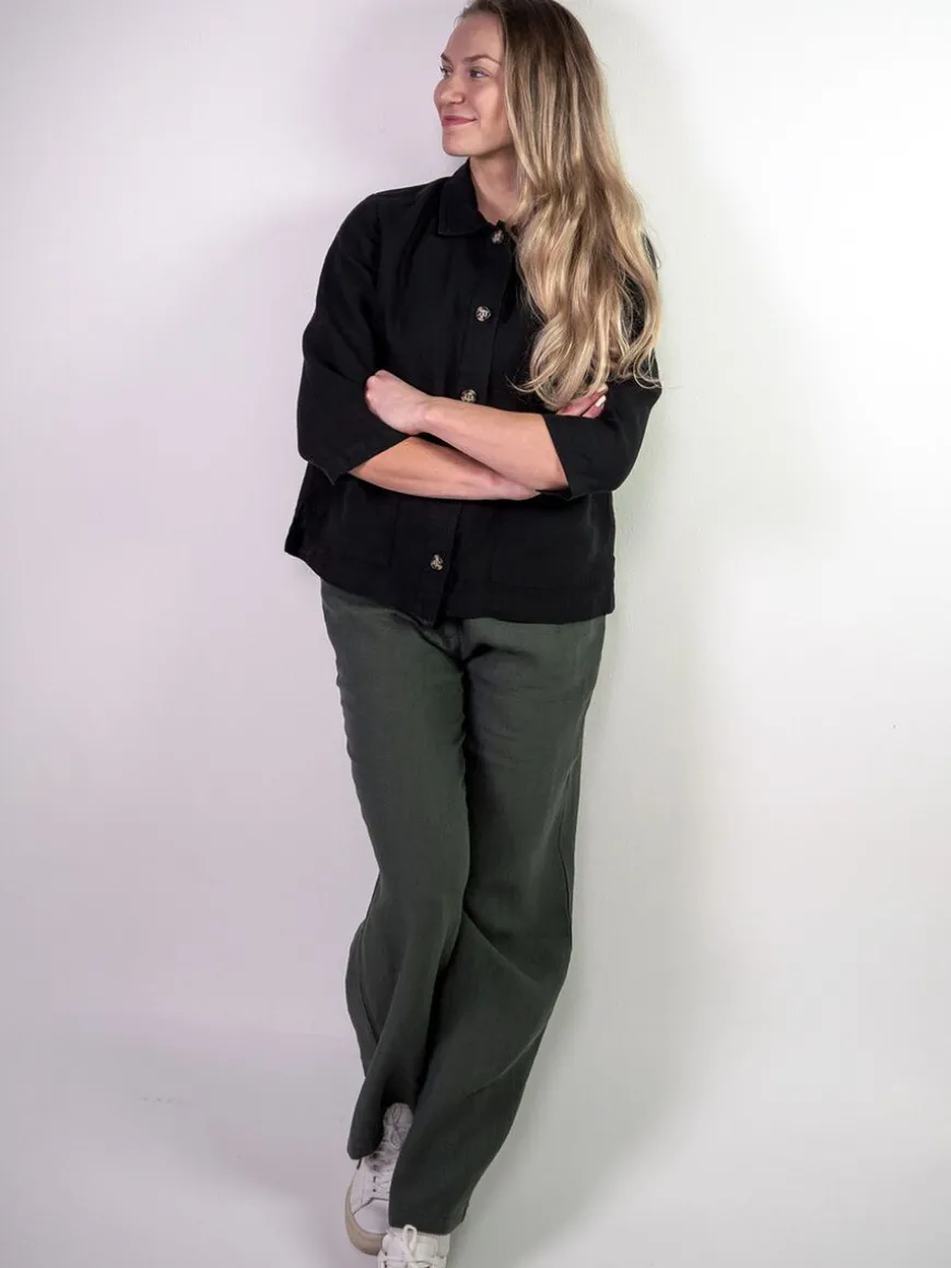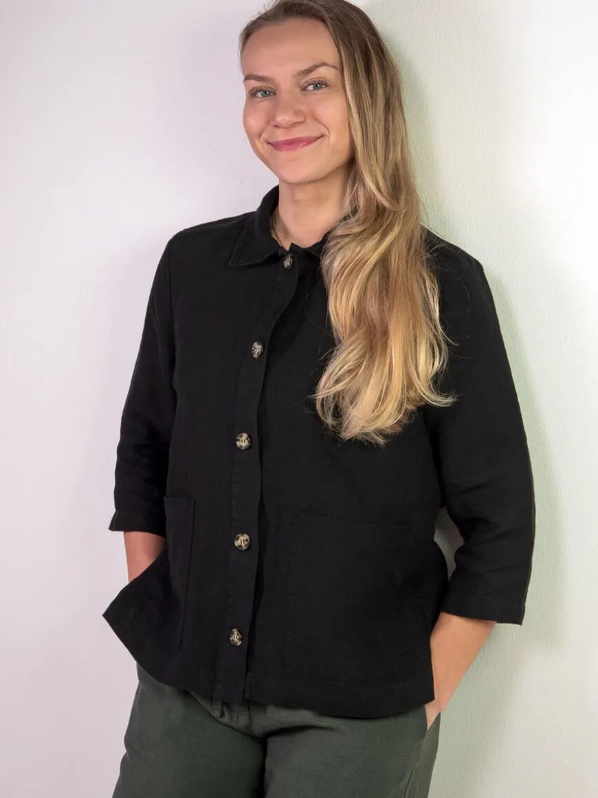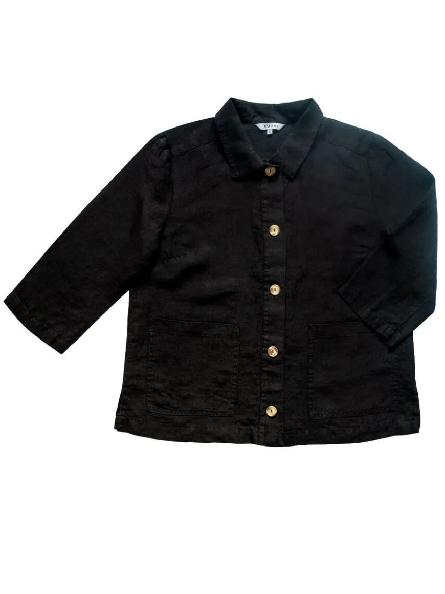 Cuosi -Merkin Elsa Pellavajakku Mustana.Elsa On Lyhyt Vuoriton Worker-Tyylinen Paitajakku, Jossa Edessä On Reilunkokoiset Paikkataskut. Elsa Sopii Kevyeksi Kesäiseksi Heittojakuksi, Kun Tarvitset Jotain Peittävämpää Päällesi Viileän Sään Varalta. Voit Käyttää Sitä Myös Paidan Tapaan Kiinni Napitettuna. Se On Kätevä Ja Siisti Jakku Matkalle Mukaan. Tyylikkään Yhtenäisen Asukokonaisuuden Saat Yhdistämällä Jakun Cuosin Asta Pellavahousujen Kanssa!Malli On Suoralinjainen Ja Mitoitukseltaan Väljä. Hartiakaarrokke Ja Väljyyslaskokset Antavat Liikkumatilaa Selkäpuolelle. Hihat Ovat Suorat Ja Puolipitkät, Edessä Nappikiinnitys Ja Sivuissa Helmassa Pienet Halkiot. Elsa On Valmistettu Laadukkaasta Kauniisti Laskeutuvasta Ja Miellyttävän Tuntuisesta Pellavasta.