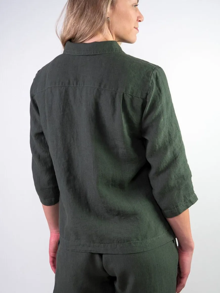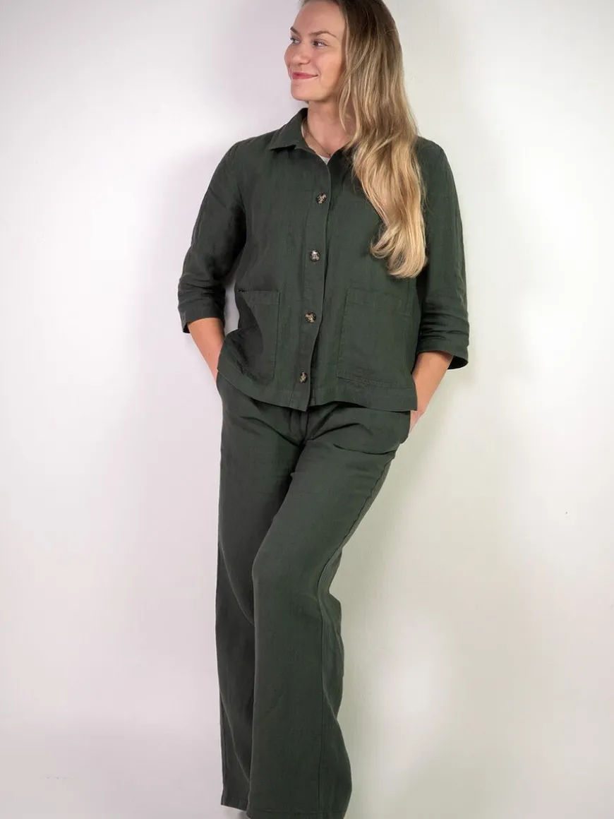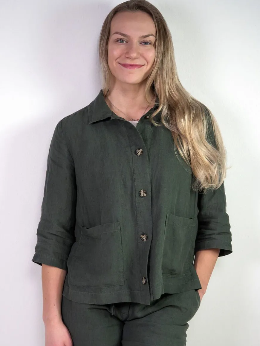 Cuosi -Merkin Elsa Pellavajakku Tummanvihreänä.Elsa On Lyhyt Vuoriton Worker-Tyylinen Paitajakku, Jossa Edessä On Reilunkokoiset Paikkataskut. Elsa Sopii Kevyeksi Kesäiseksi Heittojakuksi, Kun Tarvitset Jotain Peittävämpää Päällesi Viileän Sään Varalta. Voit Käyttää Sitä Myös Paidan Tapaan Kiinni Napitettuna. Se On Kätevä Ja Siisti Jakku Matkalle Mukaan. Tyylikkään Yhtenäisen Asukokonaisuuden Saat Yhdistämällä Jakun Cuosin Asta Pellavahousujen Kanssa!Malli On Suoralinjainen Ja Mitoitukseltaan Väljä. Hartiakaarrokke Ja Väljyyslaskokset Antavat Liikkumatilaa Selkäpuolelle. Hihat Ovat Suorat Ja Puolipitkät, Edessä Nappikiinnitys Ja Sivuissa Helmassa Pienet Halkiot. Elsa On Valmistettu Laadukkaasta Kauniisti Laskeutuvasta Ja Miellyttävän Tuntuisesta Pellavasta.
