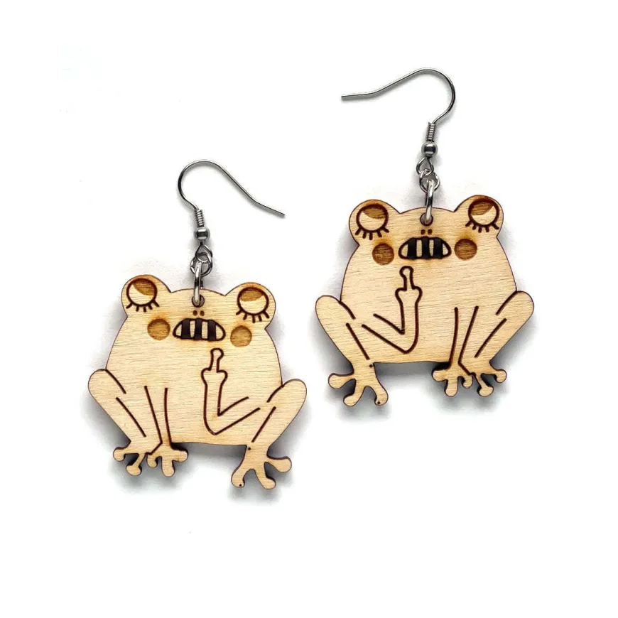Crazy Granny Designs -Merkin Frog You! Korvakorut.Mitat:Korkeus: 37 Mmleveys: 39 Mmmateriaali: Suomalainen Koivuvanerimetalliosat: Ruostumaton Teräsvältä Korvakorujen Joutumista Veden Tai Kemikaalien (Esim. Hiuslakan Jne.) Kanssa Kosketuksiin.Korut Suunnitellaan Ja Valmistetaan Suomessa.