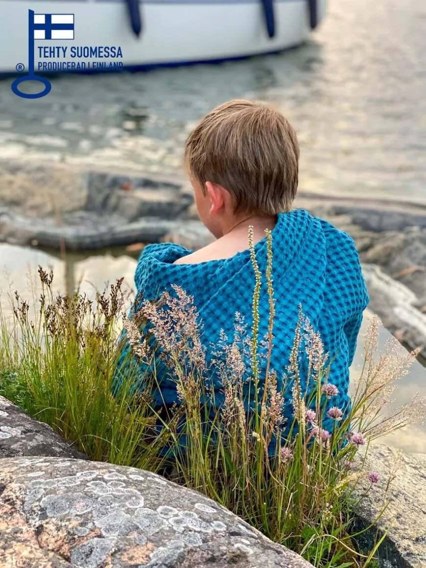 Keltainen Design -Merkin Lasten Kylpytakki Petroolin Sävyssä.Kylpytakki On Ihanan Helppo Ja Nopea Vetästä Päälle Saunan, Uinnin Ja Kylvyn Jälkeen Kotona & Mökillä. Kylpytakissa On Mukava Myös Vain Oleilla Hetki Suihkun Jälkeen. Tämä Isoruutuisesta, Paksusta Vohvelikankaasta Valmistettu Hupullinen Kylpytakki On Kiva Sekä Omille Aarteillesi Että Lahjaksi. Takista Löytyy Myös Taskut! Kokoja Taaperosta Teiniin.
