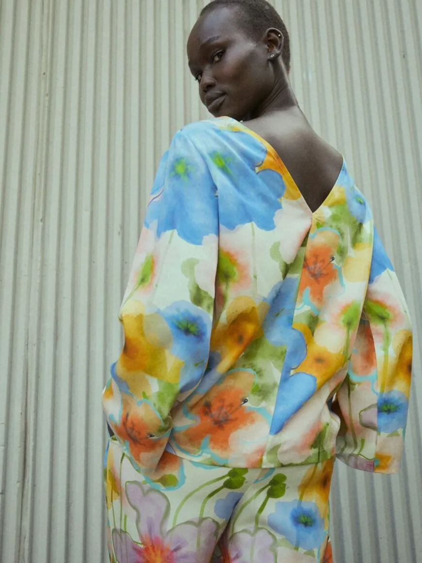 Mainio -Merkin Bouquet Paita.Ylellinen Paita Upeasti Laskeutuvaa, Kudottua Tencel Lyocellia, Jota Koristaa Kaunis Maalauksellinen Bouquet Kuosi. Yhdistä Yksiväristen Alaosien Kanssa, Tai Pue Saman Kuosin Housujen Kanssa Luodaksesi Yhteinäisen Lookin!Paidassa V-Pääntie, Jota Voit Pukea Kummin Päin Vain!