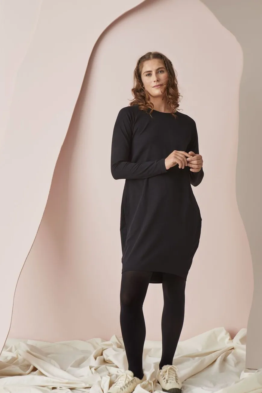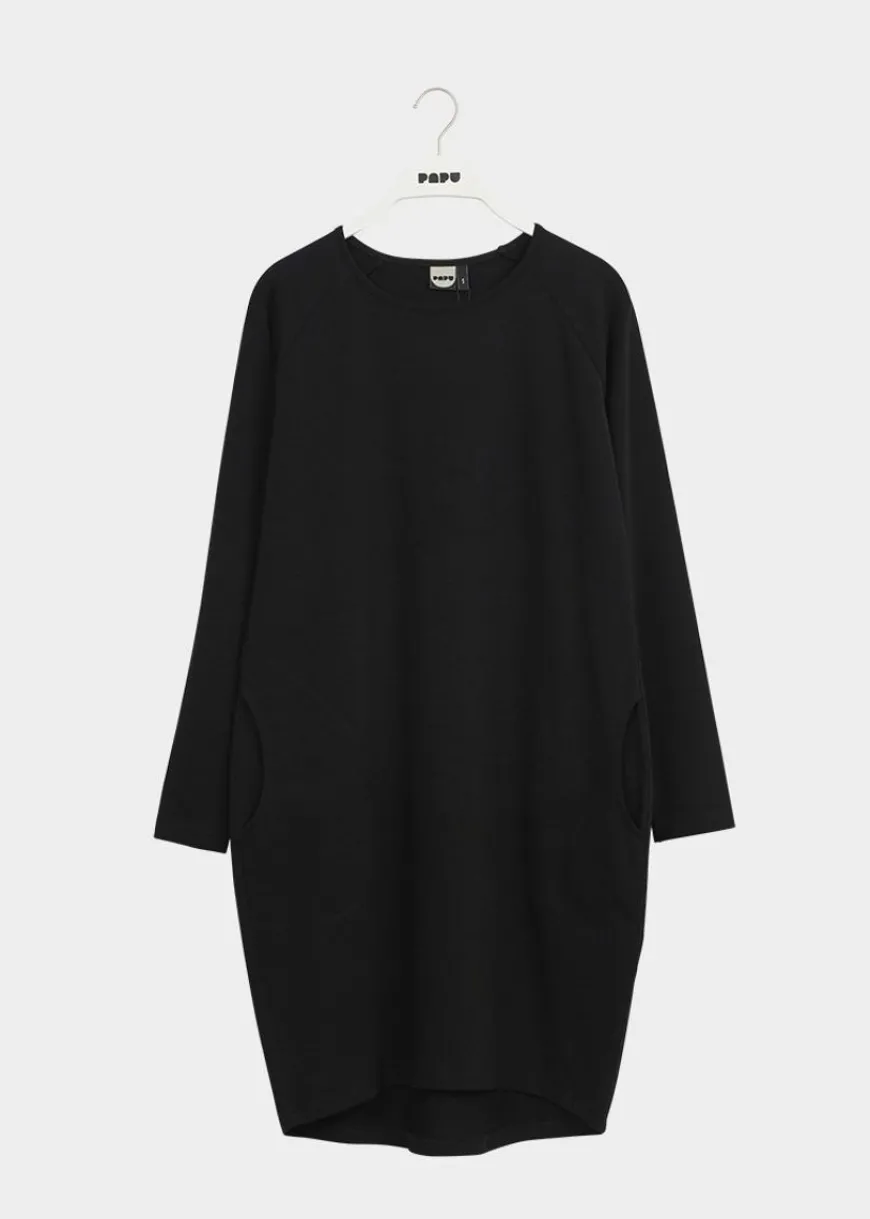 Papu -Merkin Oval Mekko Klassisena Mustana.Ovaalin Mallinen Papun Mekko Pitkillä Hihoilla On Oiva Valinta Niin Arkeen Kuin Vapaa-Aikaan. Monikäyttöinen Mekko Menee Lämpimillä Keleillä Sellaisenaan, Ja Kelien Viiletessä Sukkisten Ja Leggingsien Kanssa.Helma On Noin Polvipituinen Ja Hieman Pidempi Takaa, Edestä Löytyy Taskut. Mekko On Istuvaa Mallia, Kevyesti Leveämpi Lantion Kohdalta. Luomupuuvillasta Valmistettu Vaate Tuntuu Pehmeältä Ja On Mukavan Joustava.