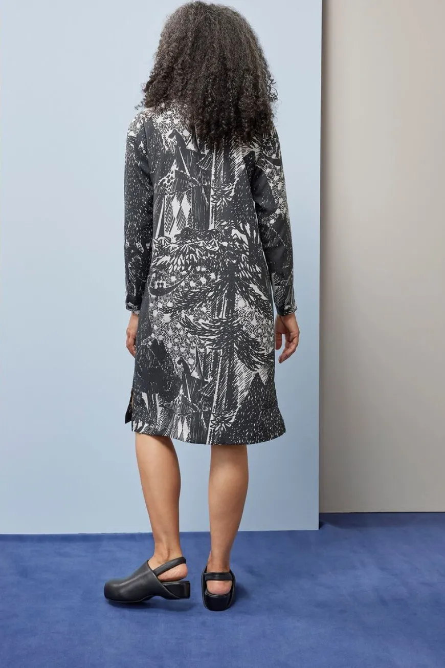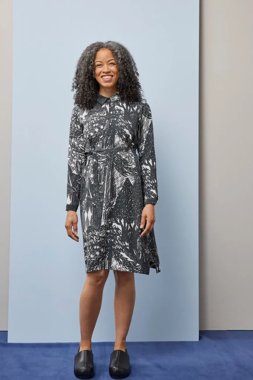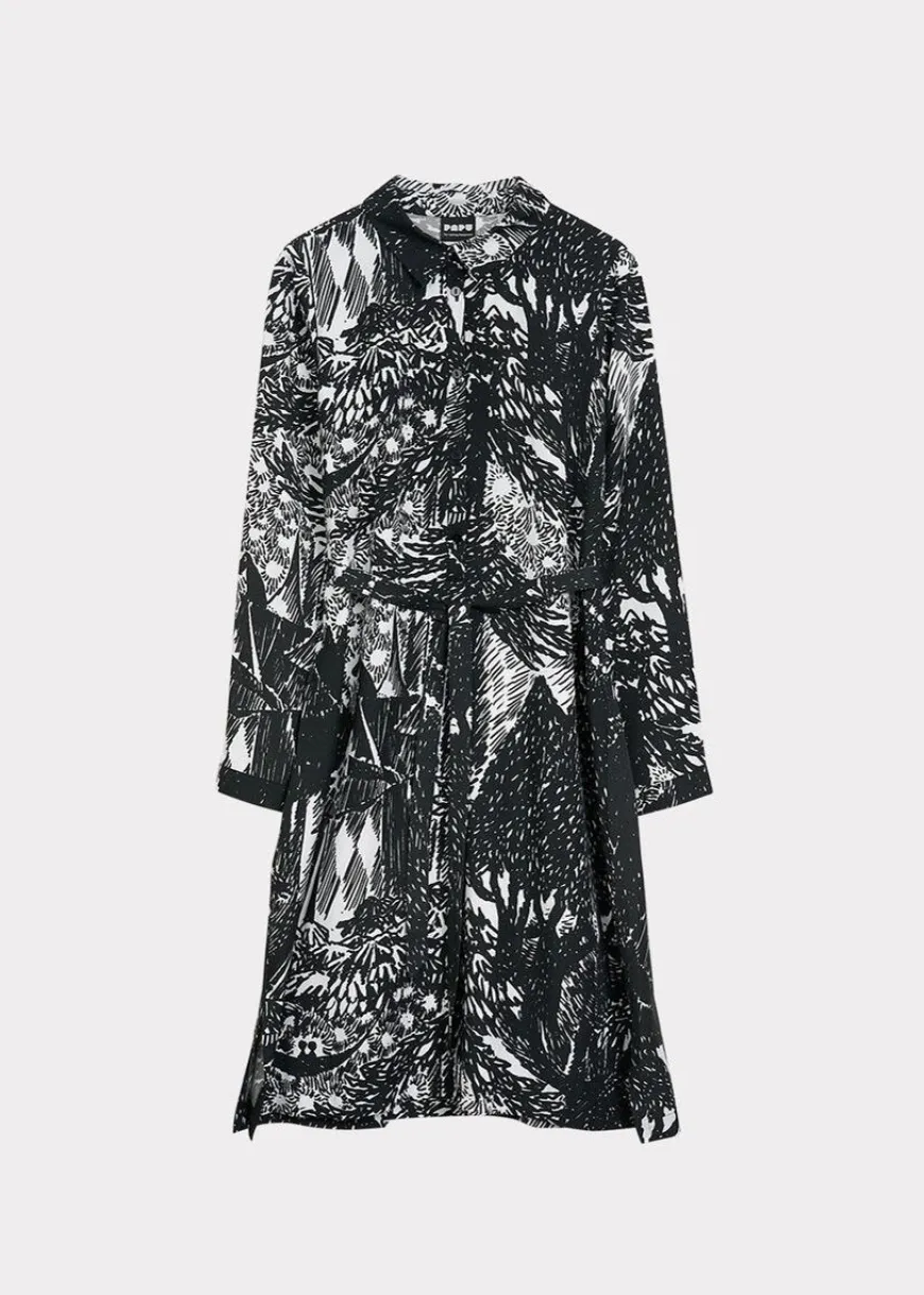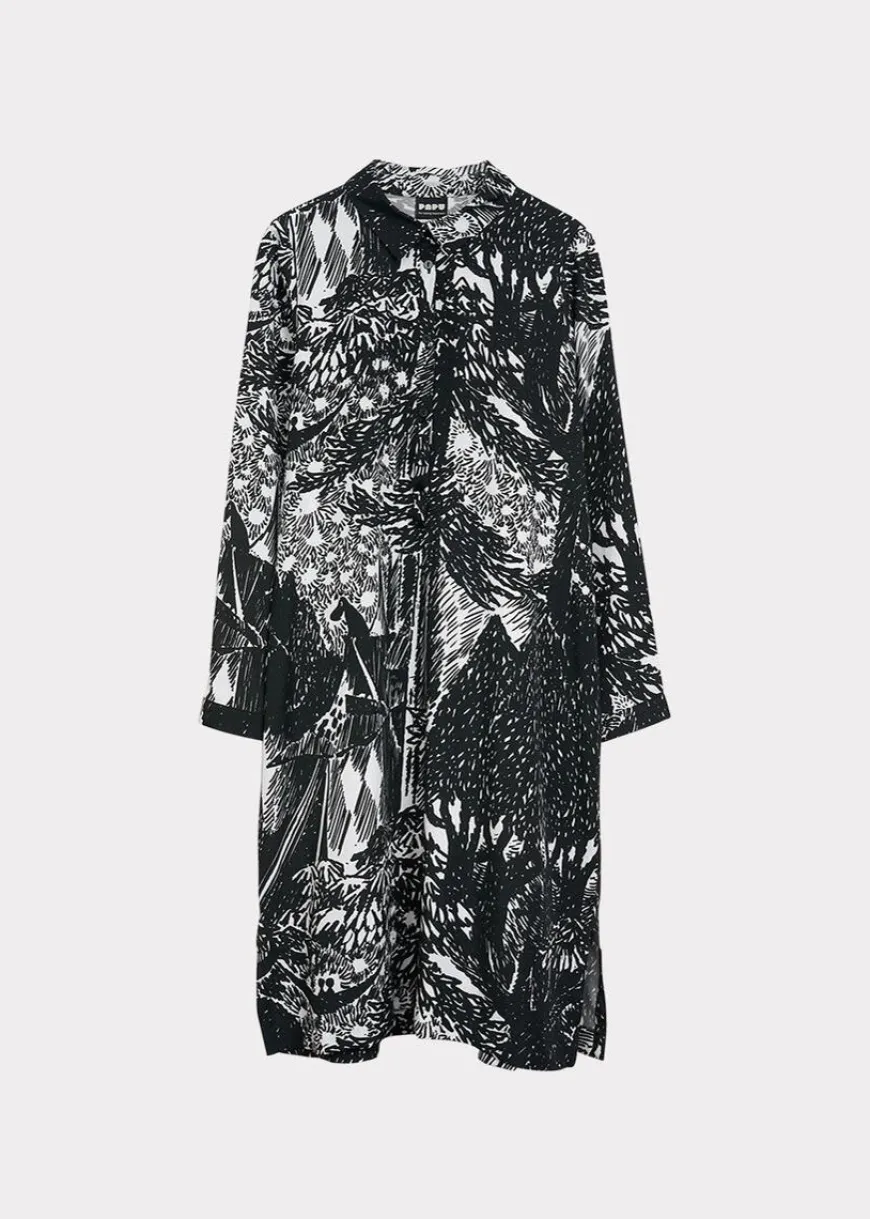 Papu -Merkin Autumn Garden Kuosinen Paitamekko.Papun Yhteistyö Moomin Charactersin Kanssa Jatkuu, Kun Tove Janssonin Näkymätön Lapsi Ja Muita Kertomuksia -Kirjan Kuvituksesta Muokattu Autumn Garden -Kuosi Tulee Osaksi Mallistoa 3 Kuvassa Hemuli On Perinyt Tyhjän Ja Rikkinäisen Huvipuiston. Tarinakuvan Lopussa Näkyy Huvipuisto, Joka On Sisustettu Ja ”Korjattu” Uudella Tavalla, Jossa Kaikki Pikkuolennot Voivat Tulla Leikkimään Ja Löytää Onnen. Autumn Garden -Kuosin Kuva-Aihe Abstrahoituu Upeasti Viivamaiseksi Mustavalkoiseksi Pinnaksi.Siro, Yläosastaan Istuva Ja Alaspäin Hieman Levenevä Suoran Mallinen Paitamekko, Jonka Voi Solmia Mukana Tulevalla Vyöllä. Mekko Sopii Töihin Ja Juhliin Ja Sitä Voi Käyttää Sekä Kapeiden Farkkujen, Että Sukkahousujen Kanssa. Pyöreä Pääntie, Siro Paitakaulus Ja Edessä Napit. Pitkissä Hihoissa On Halkiot Ja Nappikiinnitys. Helma On Takaa Hieman Pidempi Ja Helman Sivuissa On Pienet Halkiot.