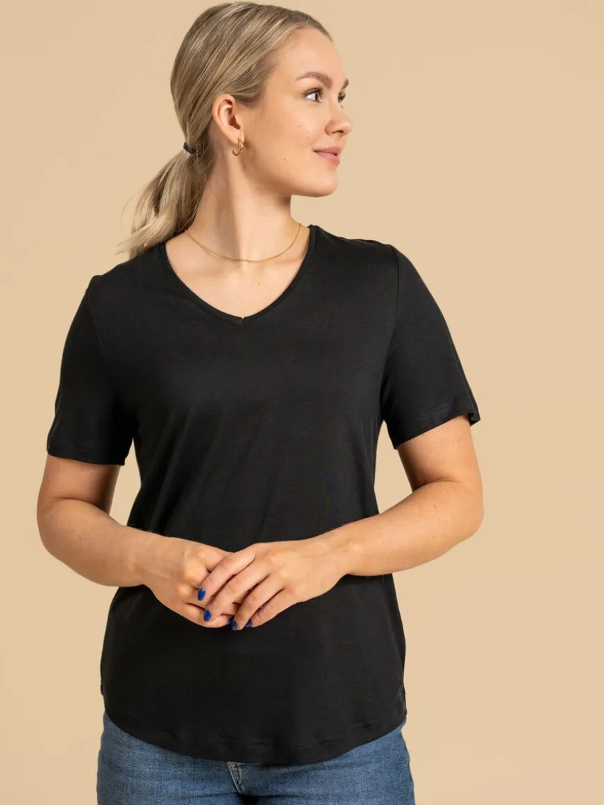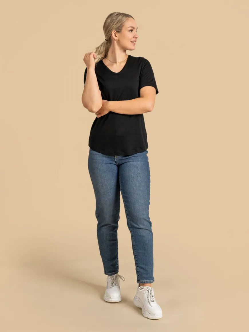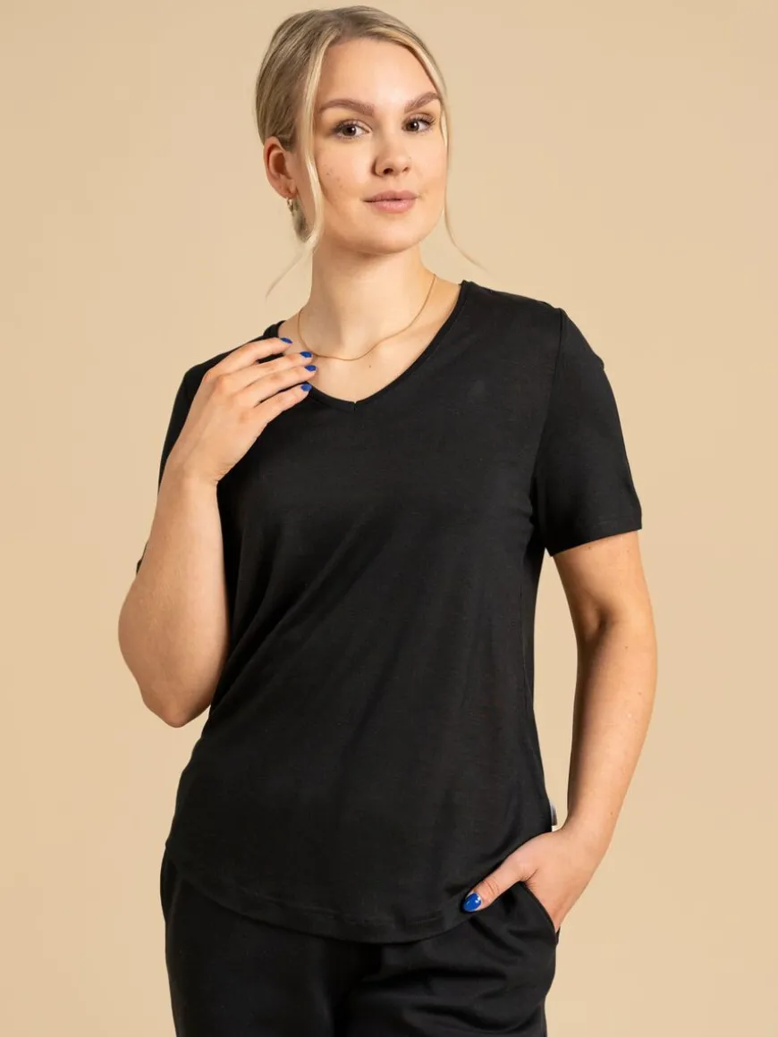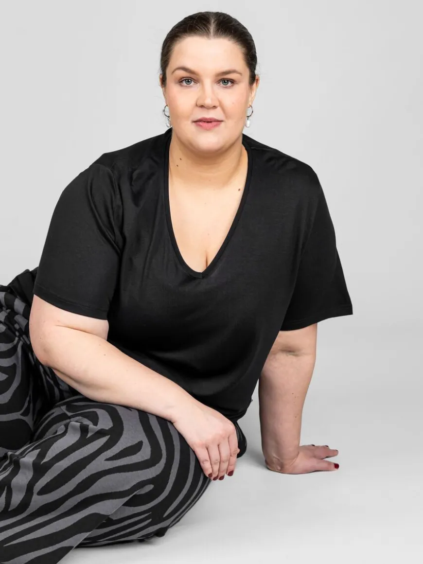 Riva Clothing -Merkin Musta Aava T-Paita.Aava On Malliltaan Istuvampi Ja Muotoon Leikatumpi Kuin Rivan Unisex-Teepparit. T-Paidan Materiaali On Sileää Ja Kevyttä Lyocellia, Joka On Käytännössä Puukuitua. Materiaali On Ihoa Vasten Mukavan Viileä Ja Silkkisen Tuntuinen. Aava On Helppo Yhdistellä Minkä Vain Alaosan Kanssa – Kesällä Sellaisenaan Ja Talvella Kerrostettuna!Pääntie On V-Mallinen, Helma On Hieman Pyöristetty.