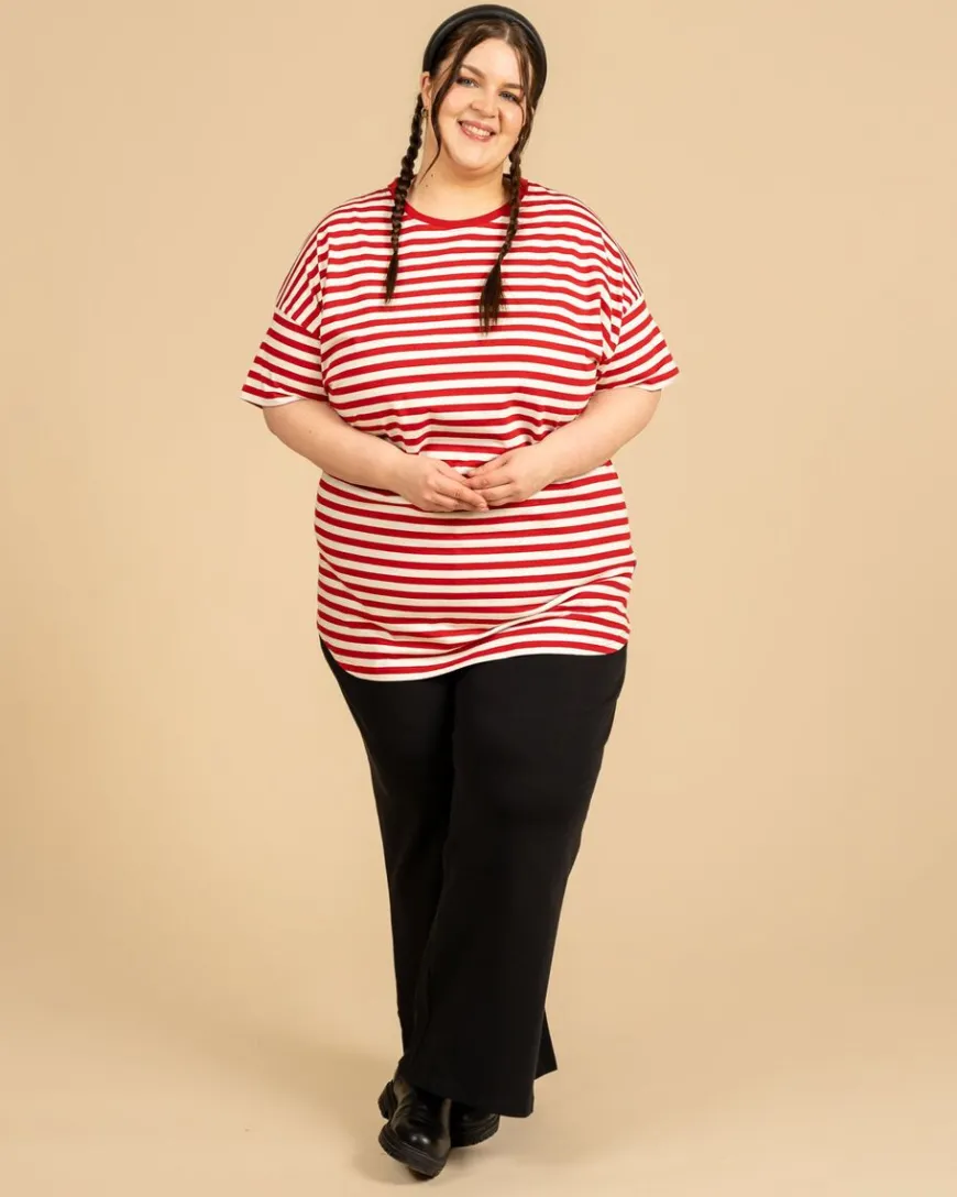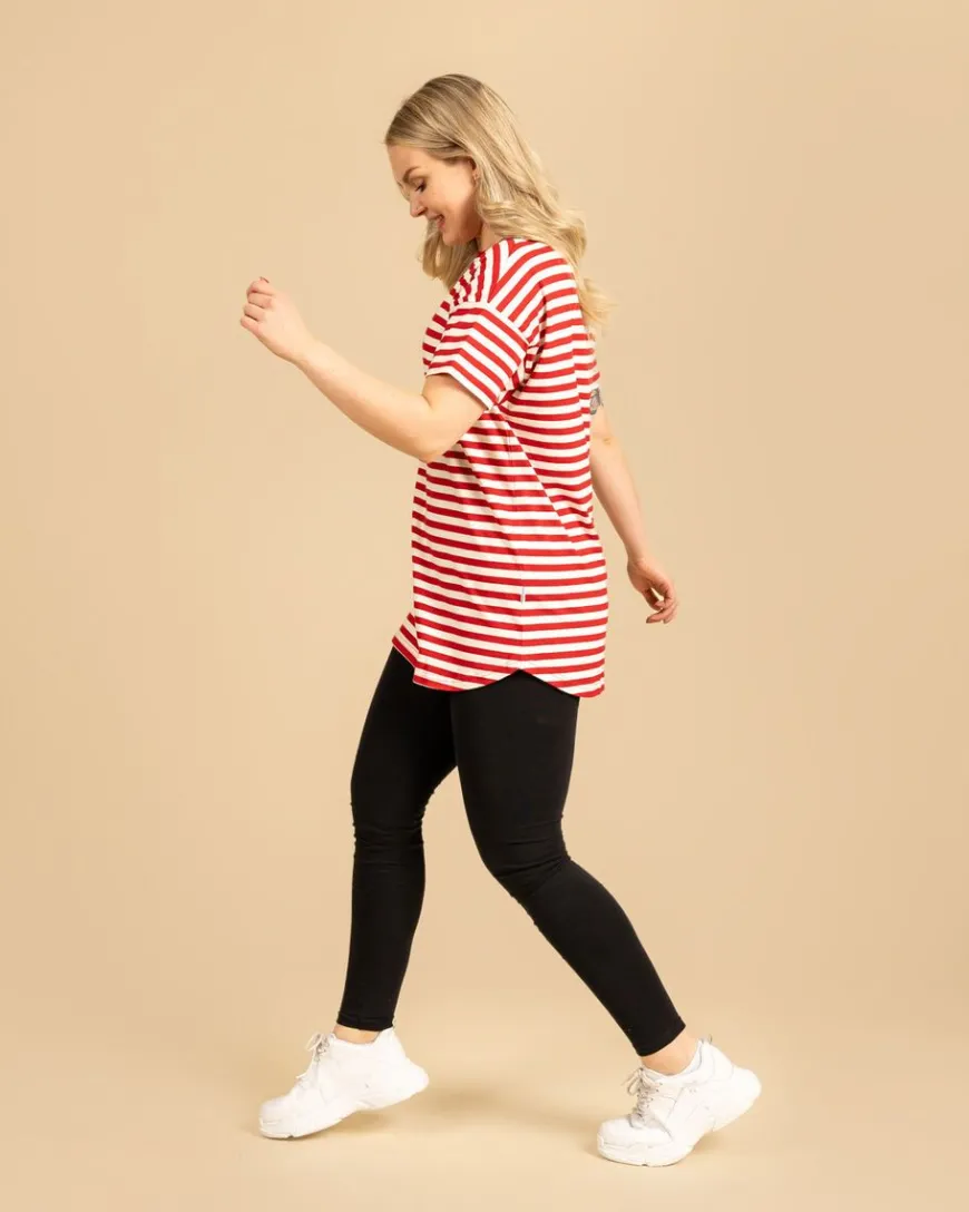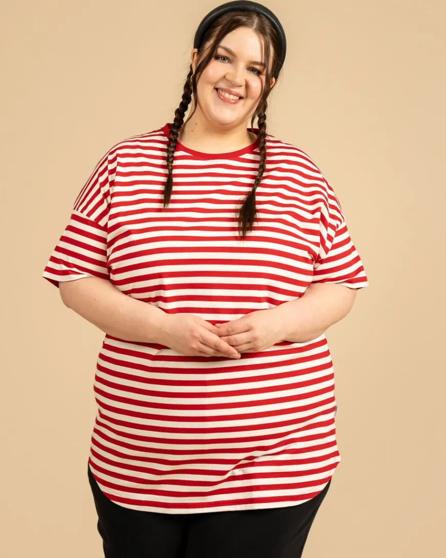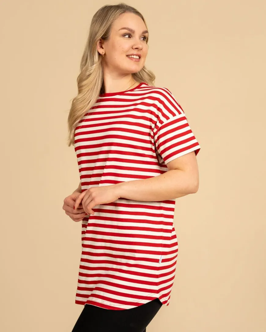 Riva Clothing -Merkin Pitkä Karpalo T-Paita. Jokaisen Vaatekaapin Yksi Kulmakivistä – Laadukas T-Paita! Raidallinen T-Paita Ja Farkut Toimii Aina, Mutta Yhdistät Paidan Hyvin Moneen Eri Asuun Ja Tilanteeseen. Pidemmän Mallisessa T-Paidassa On Lasketut Olkapäät, Minkä Ansiosta Se Istuu Paremmin Kaikenkokoisille Hartioille. Myös Kainaloihin On Jätetty Aiempaa Enemmän Tilaa, Jotta Kainalot Eivät Kinnaisi Ja Hengittävyys Olisi Taattu. Pyöristetty Helma Laskeutuu Kauniisti Kapeillekin Lanteille, Mutta Antaa Myös Tilaa Leveämmälle Lantiolle. Samalla Näimme, Että Pidempää, Pyöristetyllä Helmalla Olevaa T-Paitaa Voi Käyttää Mekon Tilalla, Yhdistettynä Esimerkiksi Neuletakkiin Ja Legginseihin. Pidempi Selkäisille Ihmisille Tämä Malli Taas Laskeutuu Mukavasti Tarpeeksi Pitkälle, Eikä Takapuoli Pääse Vahingossa Vilkkumaan.