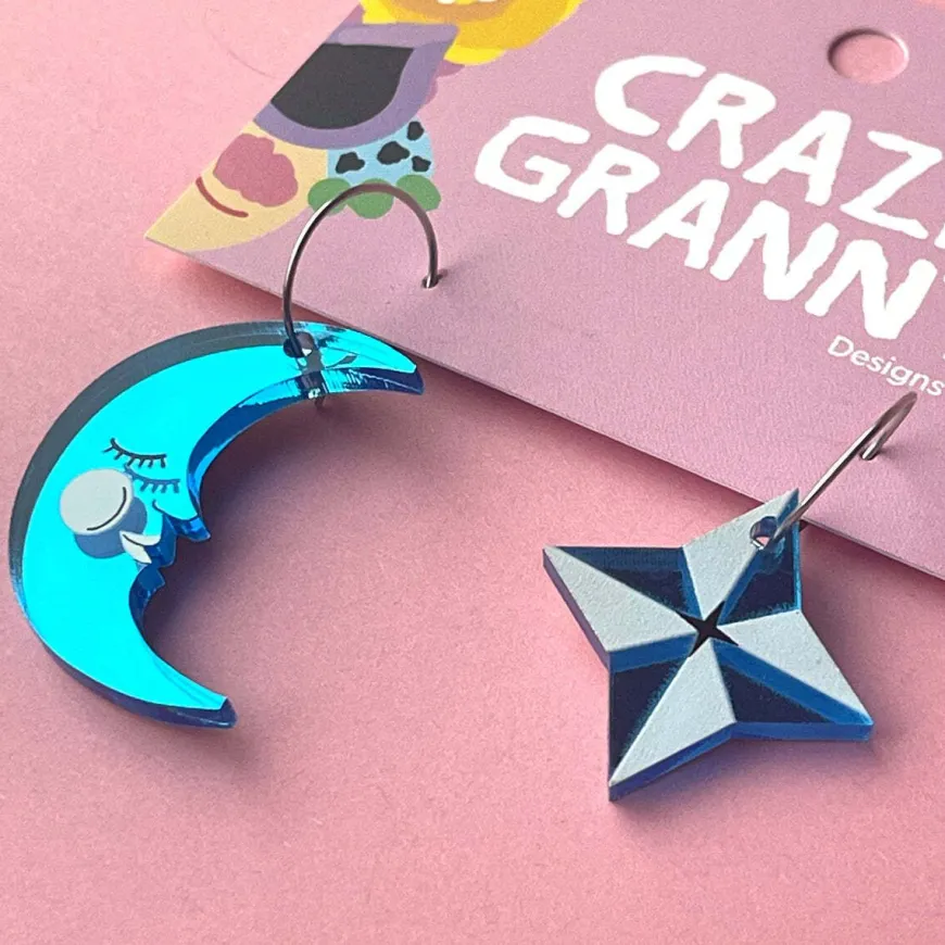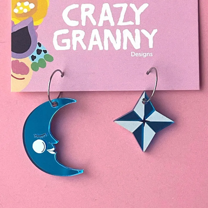 Crazy Granny Designs -Merkin Star & Moon Korvakorut Renkailla.Mitat:Kuu:Korkeus: 35 Mmleveys: 26 Mmtähti:Korkeus: 28 Mmleveys: 28 Mmrenkaan Halkaisija: 15 Mmmateriaali: Peiliakryyli, Kuvio On Digitaalisesti Printattumetalliosat: Ruostumaton Teräs Vältä Korvakorujen Joutumista Veden Tai Kemikaalien (Esim. Hiuslakan Jne.) Kanssa Kosketuksiin.Korut Suunnitellaan Ja Valmistetaan Suomessa.