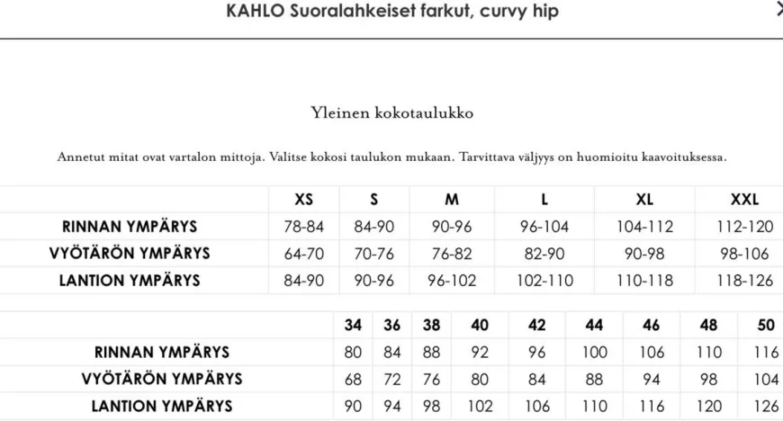 | Koko | 34, 36, 38, 40, 42, 44, 46 |